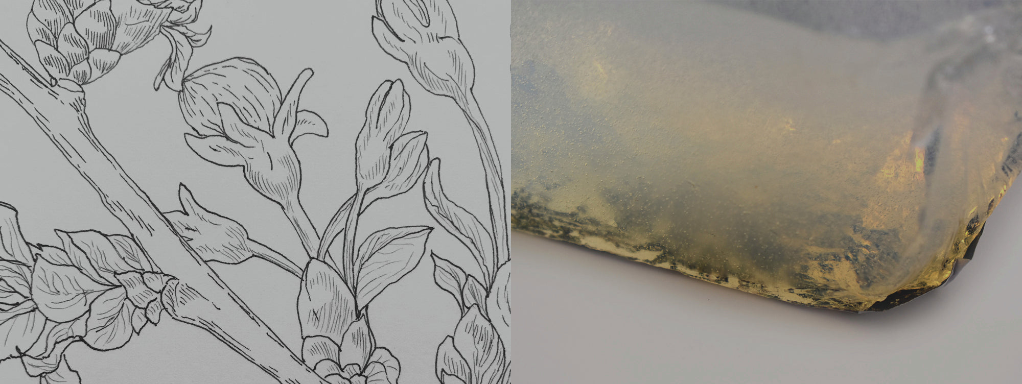 Por un lado, Bengoechea nos deleita con atractivas imágenes de flores de árboles frutales que rápidamente se verán perturbadas con la luz ultravioleta, desvelando cráneos realizados con pintura fotoluminiscente y adentrándonos en lecturas vinculadas a la vulnerabilidad de la vida o la (in)fertilidad de la naturaleza. Por otro, Pea presenta toda una amalgama de fotografías que la propia artista ejecutó en barrancos y zonas rurales de Tenerife donde sigue creciendo de manera salvaje y descontrolada la caña de azúcar, una de las especies invasoras en Canarias. Pea encapsula las instantáneas en cristal de caramelo, estableciendo un diálogo entre los conceptos de fragilidad, perdurabilidad e incerteza.