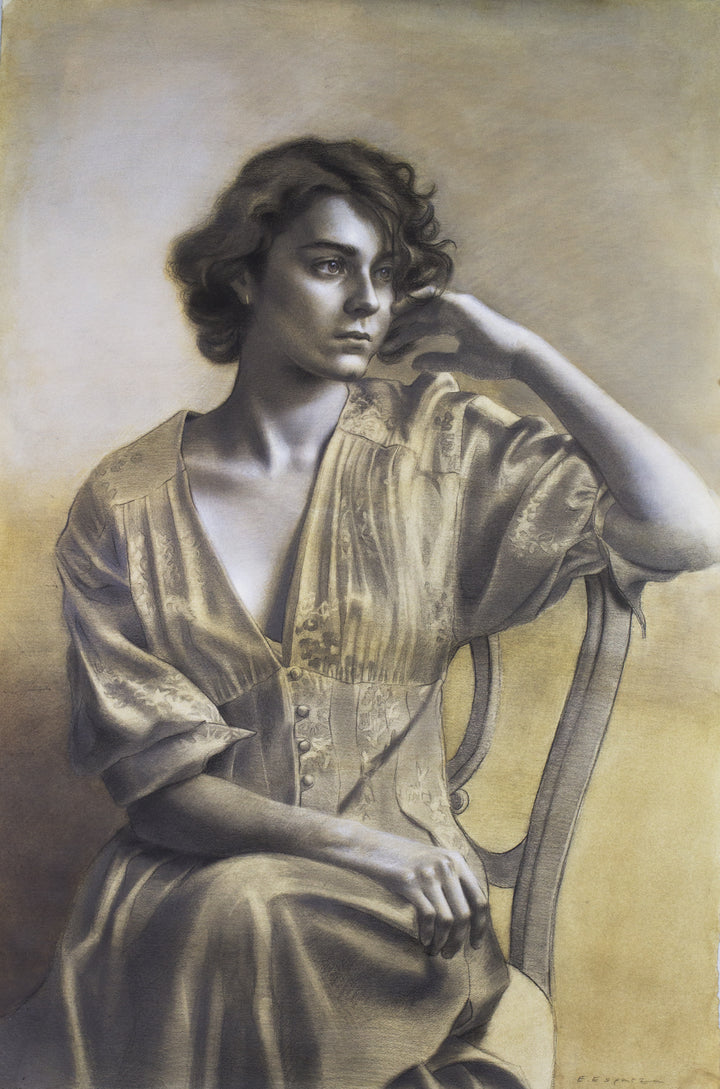 Retrato femenino de medio cuerpo sentada en una silla en monocromo. El recurso de elementos simbólicos en sus dibujos y pinturas nos habla del súper yo y el deseo de la humanidad por su transformación...