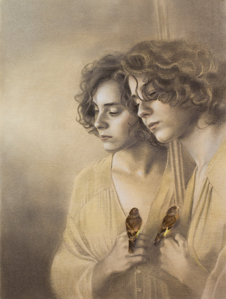Retrato de mujer frente a espejo con pájaro en la mano con colores monocromáticos. El recurso de elementos simbólicos en sus dibujos y pinturas nos habla del súper yo y el deseo de la humanidad...