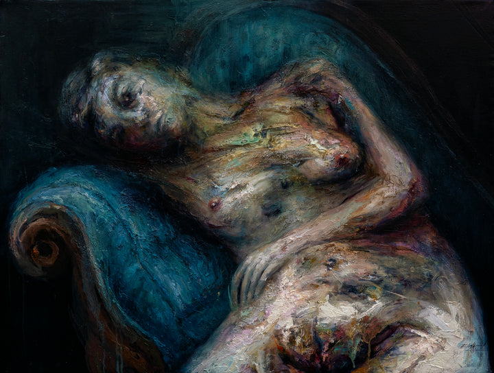Una figura femenina se recuesta a un diván azul. Desnuda, expone su sexo en primer plano, mientras surge del negro intenso del fondo. La violencia del trazo y colocación de empastes desgarra el cuerpo cansado...