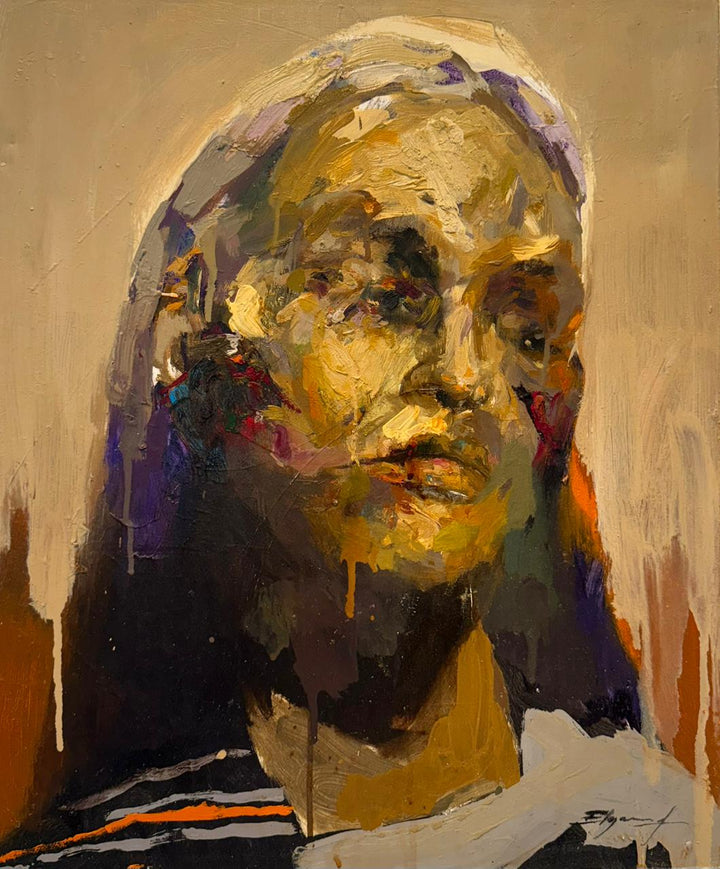 Retrato frontal de una figura femenina. La imagen se resuelve en variaciones cromáticas que parten del ocre y llegan al morado. La mancha y el empaste dominan la composición.