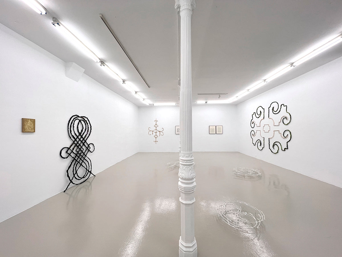 El «texto» con su propia densidad, la entidad originaria a partir del cual se hace posible el paratexto y sus dos variantes (epitexto y peritexto), además de encuerparse y nutrirse en las piezas, se encuentra en un cuadernillo presente en la exposición. Este lo conforman las referencias teóricas o literarias y otros acompañamientos escritos, tanto a esta exposición de Emmanuela Soria Ruiz, como a Meshworks de Maggie Cardelús, primera parte del proyecto con la que se abordó el epitexto en 2022, y de la que se muestra aquí una pieza.