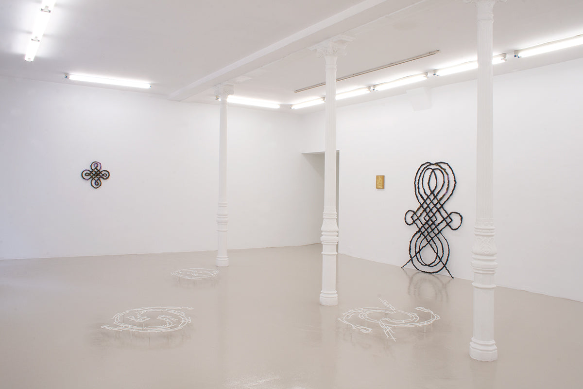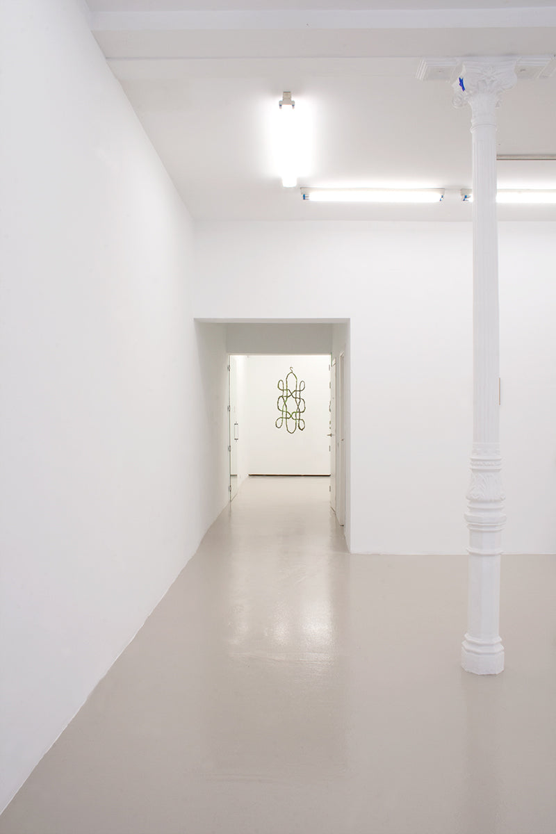 En cualquier lugar fuera presenta la exposición como un paratexto, una suerte de travestimiento o prolongación en la galería del acompañamiento textual del trabajo de la artista. Al trasladarse el foco sobre lo escrito, lo que sucede en el espacio expositivo deviene en una extremidad del mismo, un estiramiento o prolongación, que le aporta una nueva textura a través de la exposición.