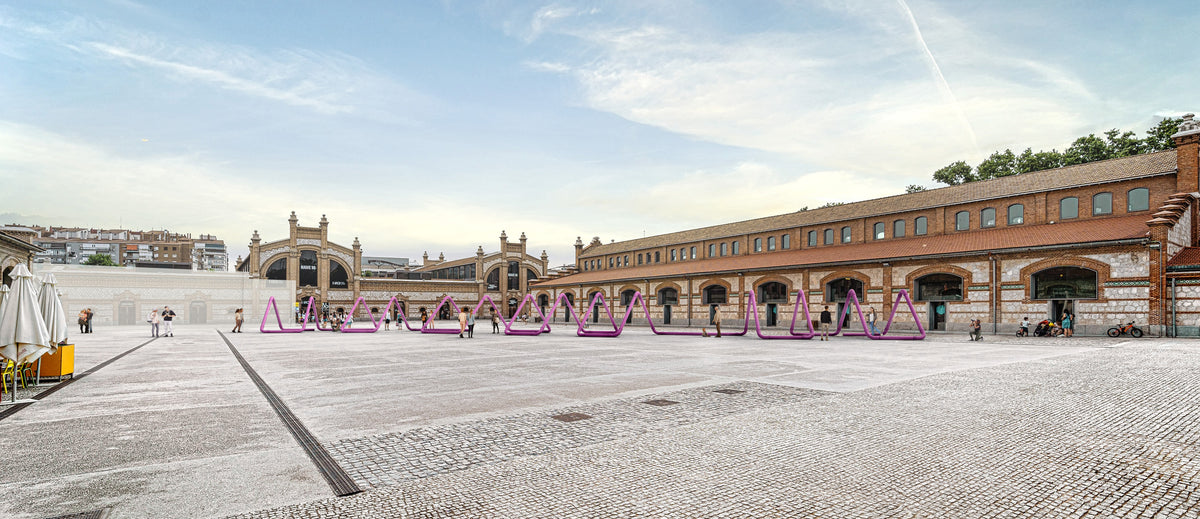 La construcción de la pieza filiforme CDC Matadero responde a un juego modular donde se dan una serie de alteraciones de lo estandarizado. El tubo morado surge y se eleva del suelo mostrándose como un elemento visible poderoso que lejos del fin industrial de estar escondido bajo tierra, se manifiesta como una entraña, con un poder imposible de esconder o silenciar. Desde varios puntos de vista, su presencia nos muestra un garabato que se repliega y curva al son de su autonomía. CDC Matadero puede verse como una forma que propone un recorrido al atravesar la plaza o como una estructura que invita a un juego sin normas.