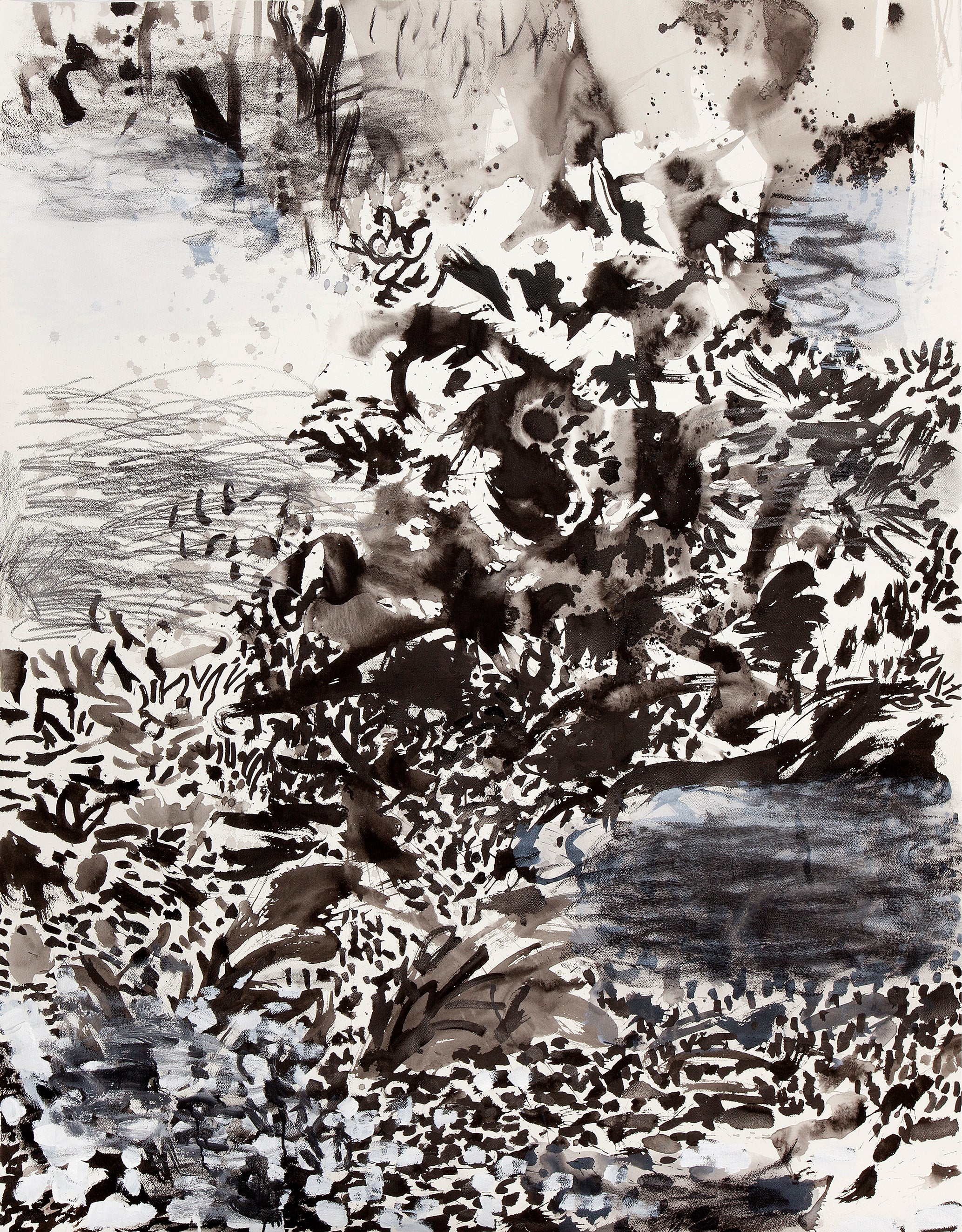 Quitar el color a la obra de este artista es dar una nueva transcendencia a otras capacidades y características de su trabajo que generalmente vienen a la mirada después del impacto del color. Así de repente nos metemos de lleno en un mundo de talento y saber en la utilización de las herramientas, en la amplia aptitud de grafismos, trazos y texturas, resultando una enorme riqueza en los usos de la materia con la que se expresa. Al final el signo se convierte en escritura que se despliega como un poema escrito.