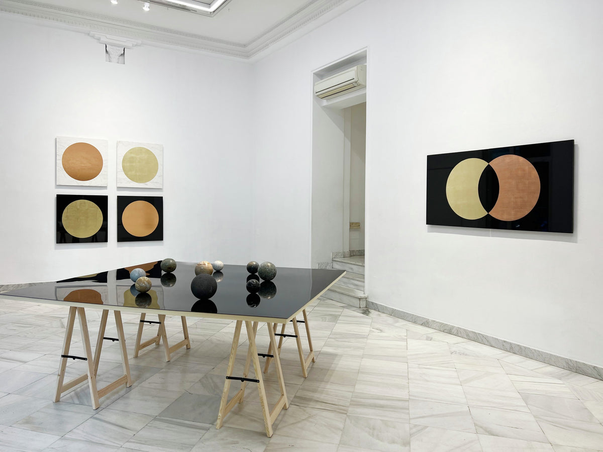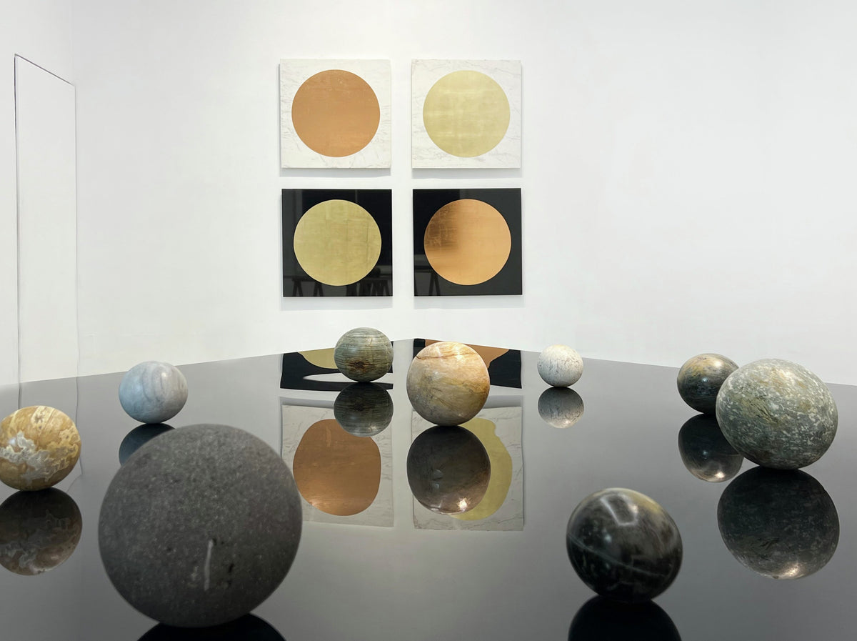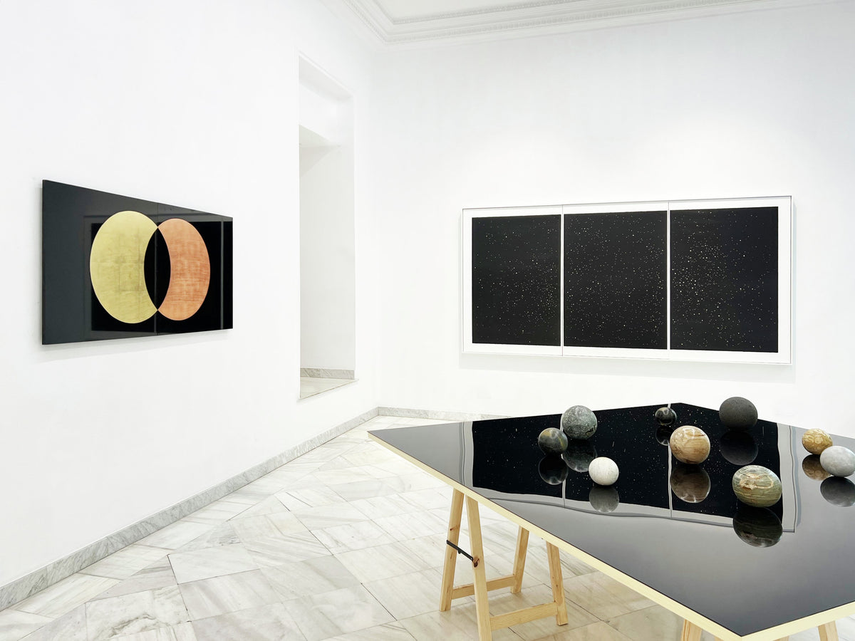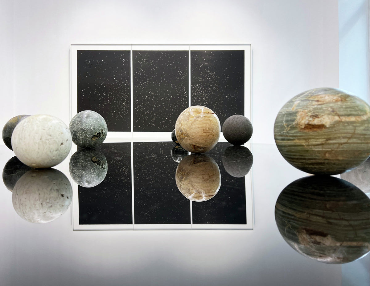 Orbes, de Edwin Monsalve, deviene de una mirada continua y atenta a lo que implica el concepto de paisaje. Las esferas presentes en la exposición aluden a los astros y parecen arrancadas fortuitamente de geografías cotidianas; son rocas encontradas o sustraídas de entornos naturales o urbanos. Orbes renueva los gestos desde prácticas derivadas del método científico, aunada a modos de ver y clasificar, que sirven para describir el origen de todo, incluidas las formas heterogéneas de la naturaleza misma. A la vez, recuerdan un diagrama del cielo nocturno, como en la obra Infinitos, de puntos sobre el mapa de una galaxia lejana.