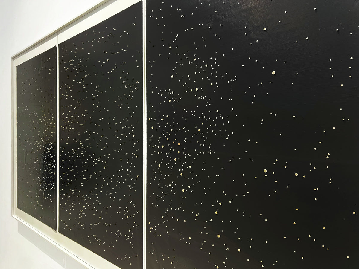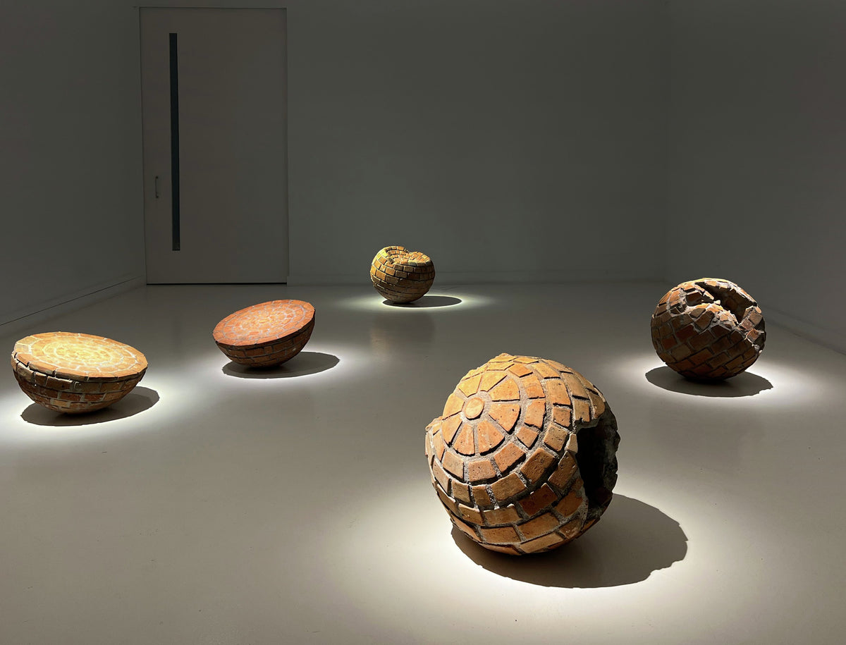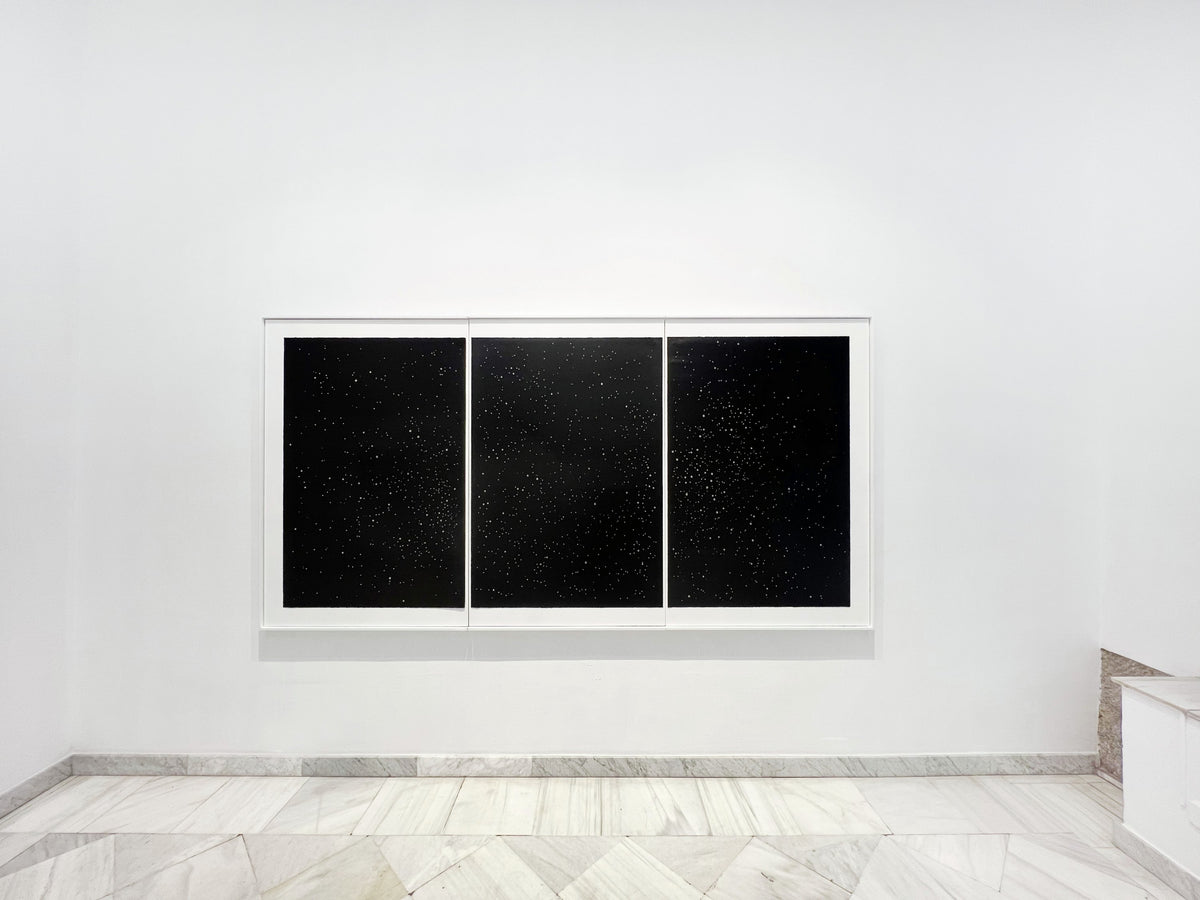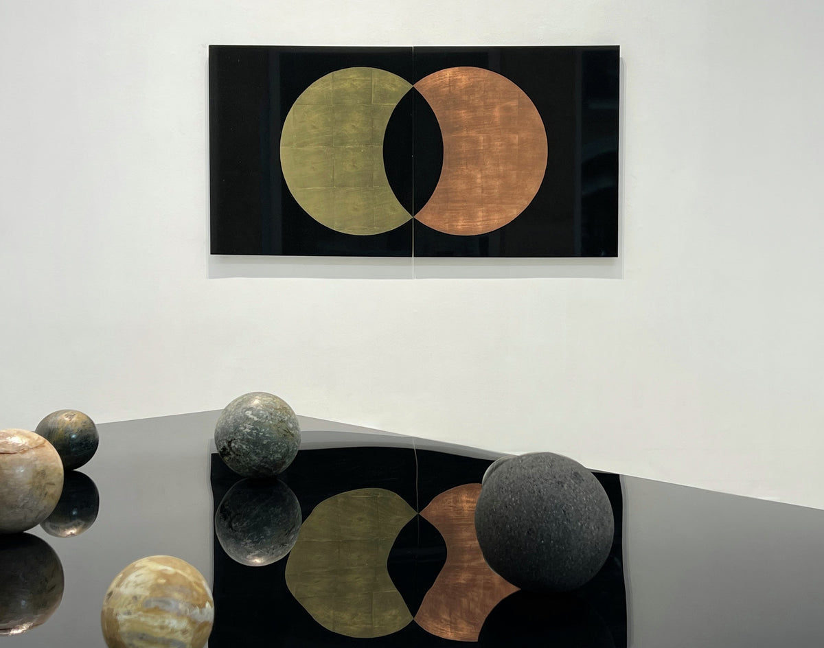 Orbes, de Edwin Monsalve, deviene de una mirada continua y atenta a lo que implica el concepto de paisaje. Las esferas presentes en la exposición aluden a los astros y parecen arrancadas fortuitamente de geografías cotidianas; son rocas encontradas o sustraídas de entornos naturales o urbanos. Orbes renueva los gestos desde prácticas derivadas del método científico, aunada a modos de ver y clasificar, que sirven para describir el origen de todo, incluidas las formas heterogéneas de la naturaleza misma. A la vez, recuerdan un diagrama del cielo nocturno, como en la obra Infinitos, de puntos sobre el mapa de una galaxia lejana.