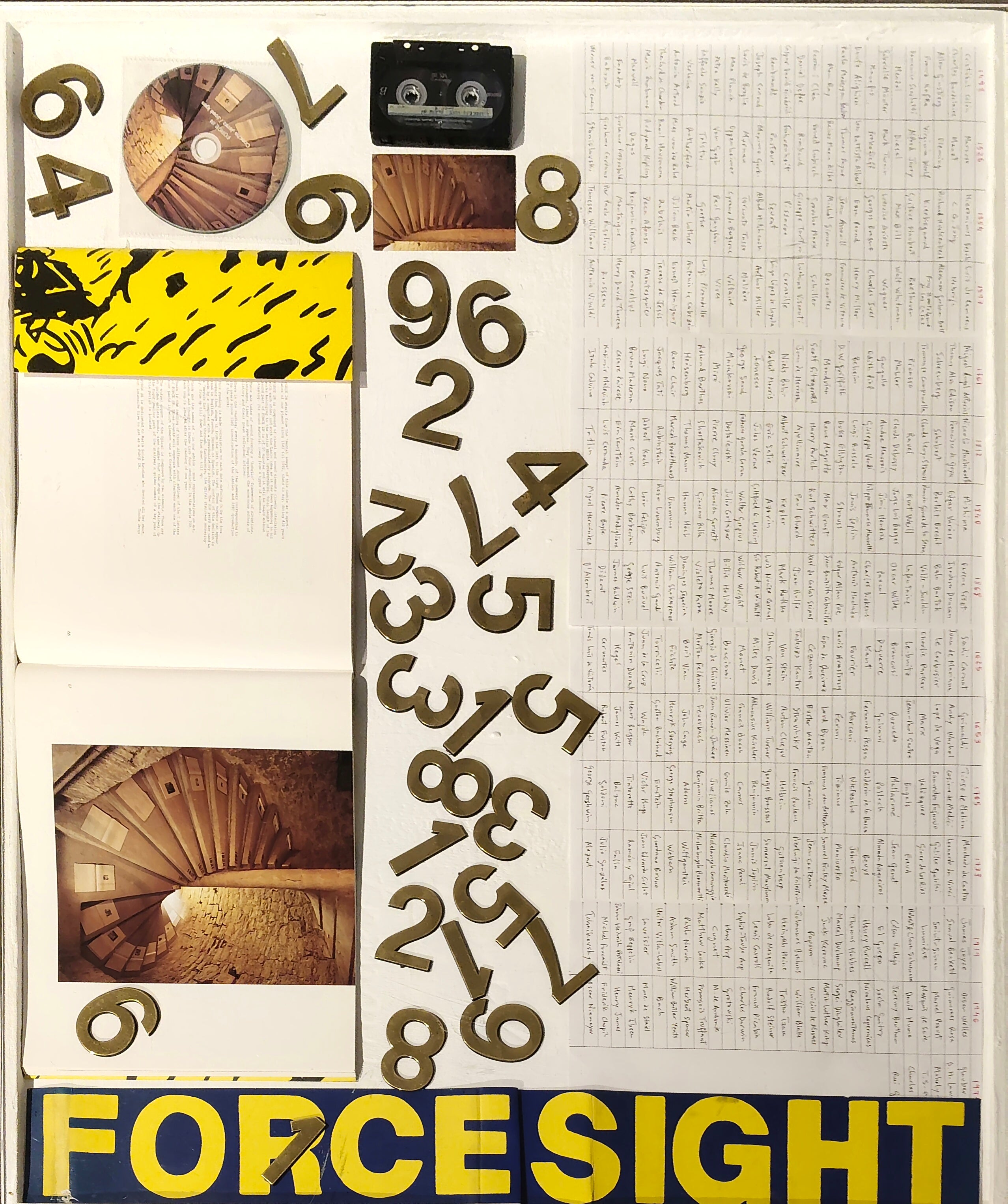 Instalación compuesta por 2 dibujos originales enmarcados + 2 fotos enmarcadas + partitura de la obra original enmarcada + sonido de la obra original en QR + libro del proyecto + Libro original + materiales de los libros originales + Cassete original de Force In, CD de Force In + Listado de los nombres de las personas que aparecen en la obra sonora de Force In + Catálogo de Force Sight (1992) y números dorados procedente de las instalaciones.