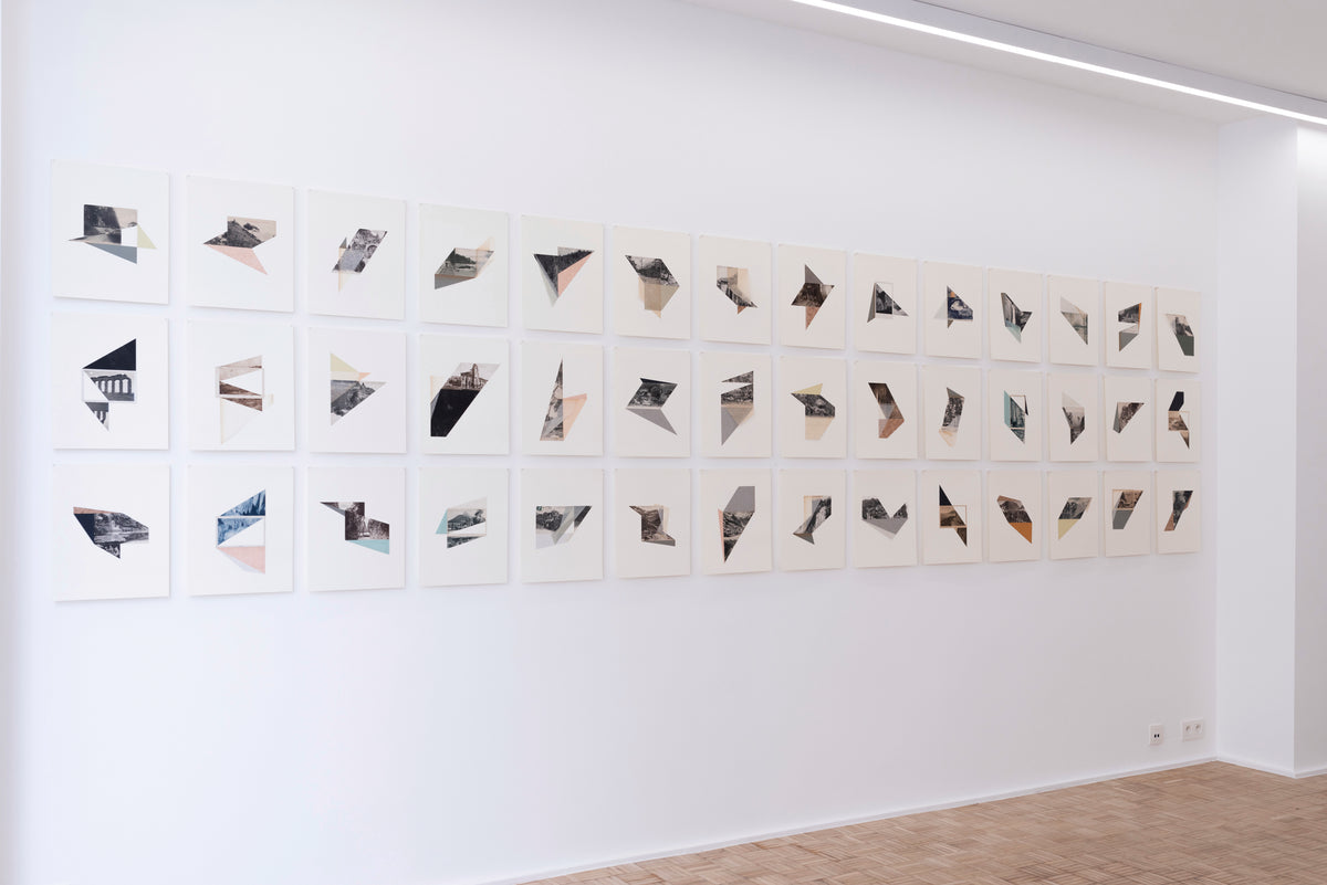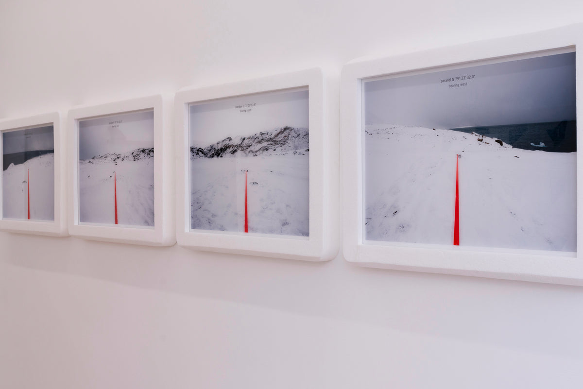 The exhibition includes the collage series ‘Terrain Vague’, in which he re-uses old postcards that crystallise the memory of a place and an era. Drawing ‘Mise en Abyme’ made with graphite on black pvc which reflect the light and play with the concept of mise en abyme. Here the material becomes a mirror and the drawing, depending on the angle of view, appears and reinvents itself before our eyes. One never ceases to wonder about the creative process as much as about the territory, both familiar and distant, created by Marcelo Moscheta. The work ‘Trauma’, made of stones collected in the Trebbia valley, calls for the re-signification of objects, here the shattered stone becomes a memory that materializes the traces of a heavy past. It is through the subtle evocation of memory that the artist takes us into another space-time that makes us travel in the memories of places and images, where humans plays the role of actor. ‘A Line in the Arctic’ are a series of unique photographs made in the Arctic Pole where a colored line made with adhesive tape was placed on the ground trying to follow the exact parallel and meridian lines of North, South, East and West. But the GPS signal often failing for unknown reasons caused a doubt about the precision of the action defining our failed attempts to measure and grid the world with certain parameters which most of times seems so displaced from the reality and characteristics of the landscape.
