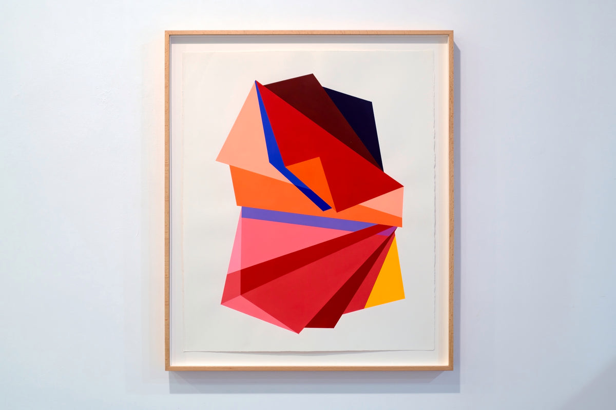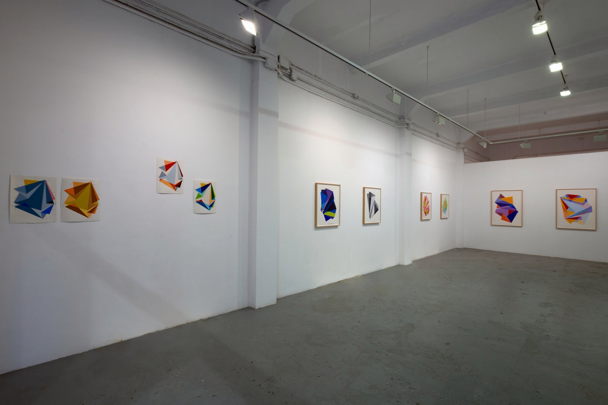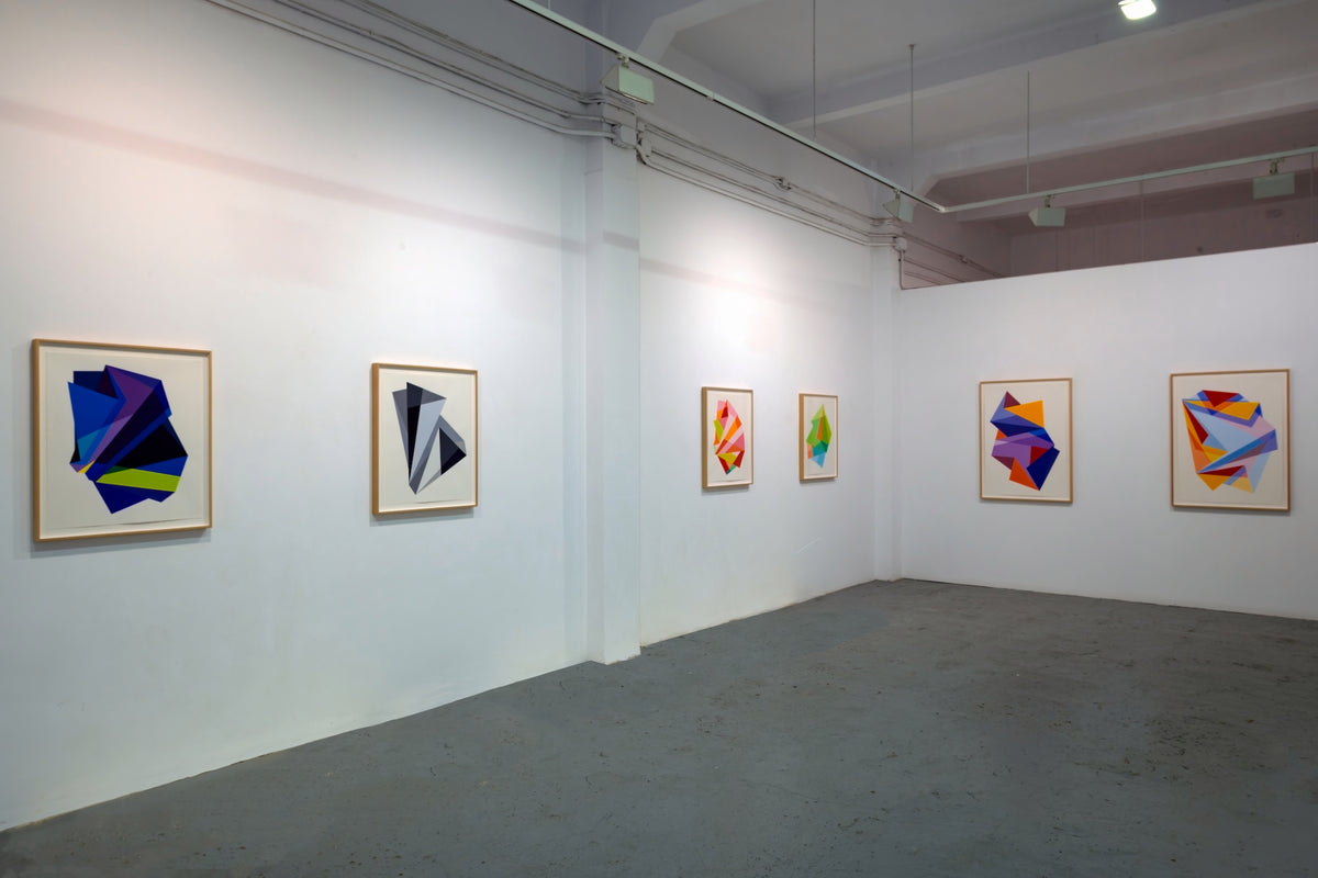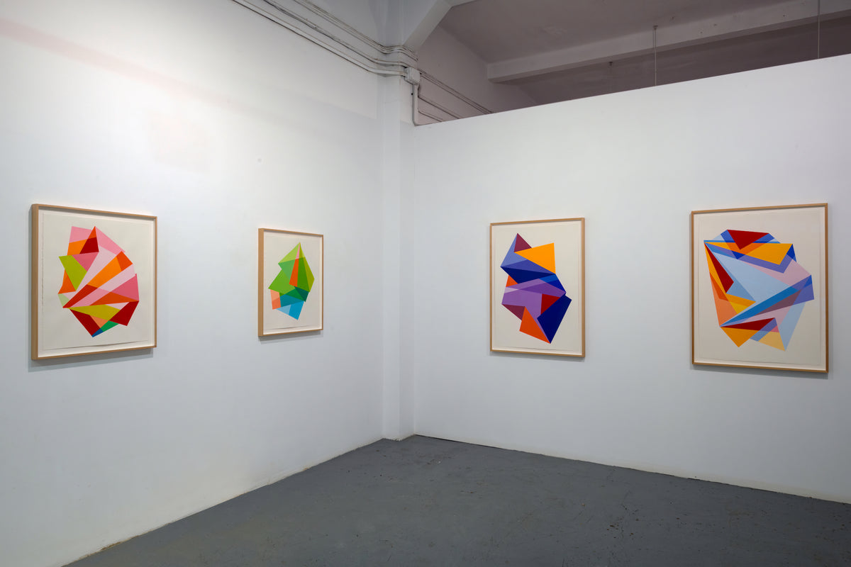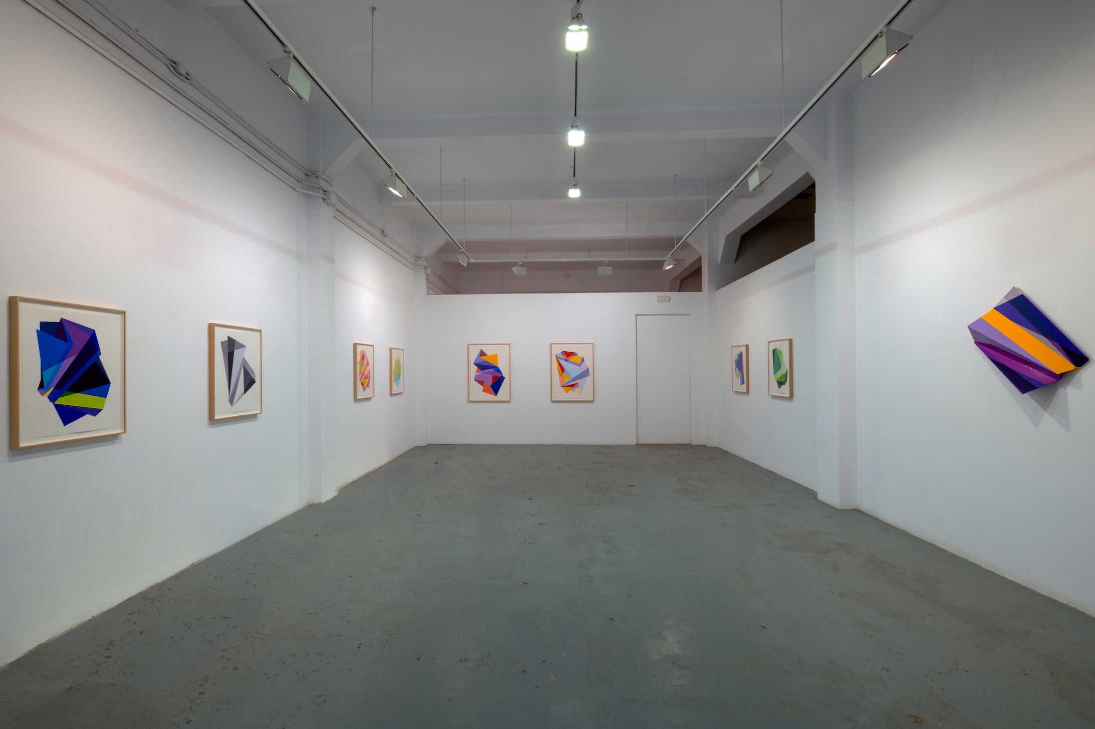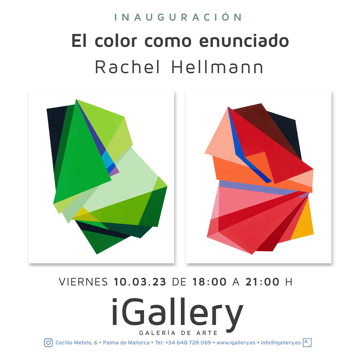 En el trabajo de Rachel Hellmann parece haber, en principio, dos elementos prominentes y claramente distintos que orquestan todo su lenguaje dentro de los estrictos cauces de la abstracción geométrica. Se trata de la línea y el color. Las formas geométricas precisas de Rachel Hellmann remiten a fragmentos de arquitecturas. Se asemejan a retales de construcciones inacabadas, elementos rescatados para albergar el color. Para conseguir esta aparente inmediatez, es necesaria una composición atenta en la que no se ahogue el factor intuitivo, sino que se imponga. La artista vigila con eficacia el ritmo de la exposición, proponiendo un conjunto de obras con una infinidad de ecos entre ellas. El color, repetimos, es el gran protagonista. Su percepción física supera los límites del papel y de la madera para aventurarse en un espacio mucho más amplio. Las líneas rectas y los ángulos, tras una prolongada atención a las esculturas-pinturas y a las pinturas sobre papel, desaparecen. Entre las obras, los colores se mezclan continuamente.