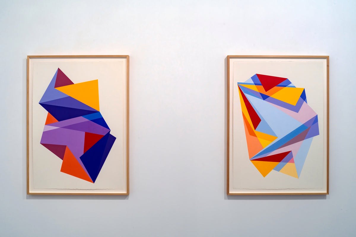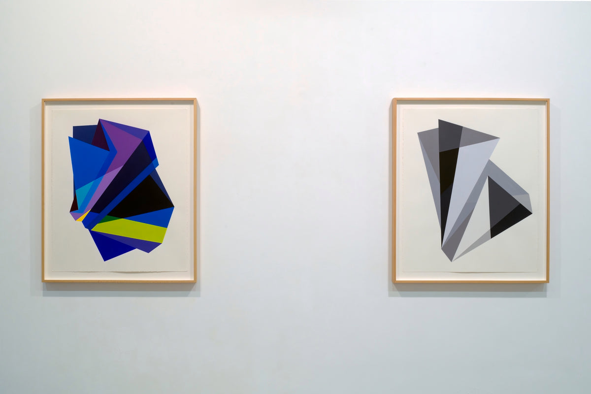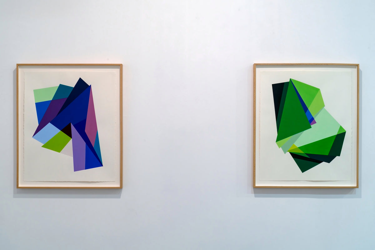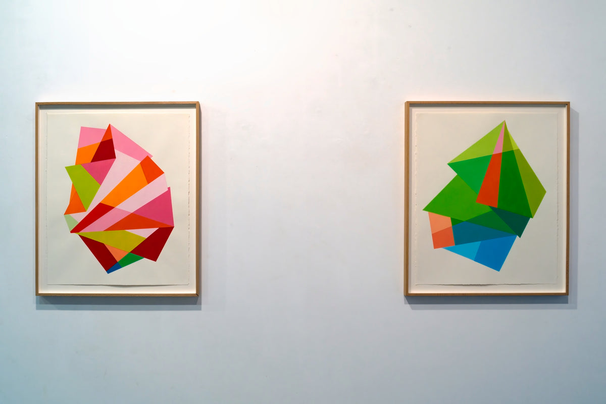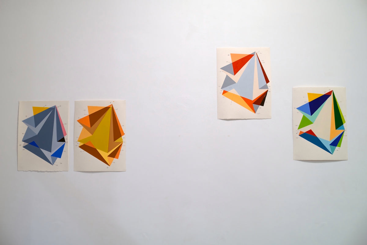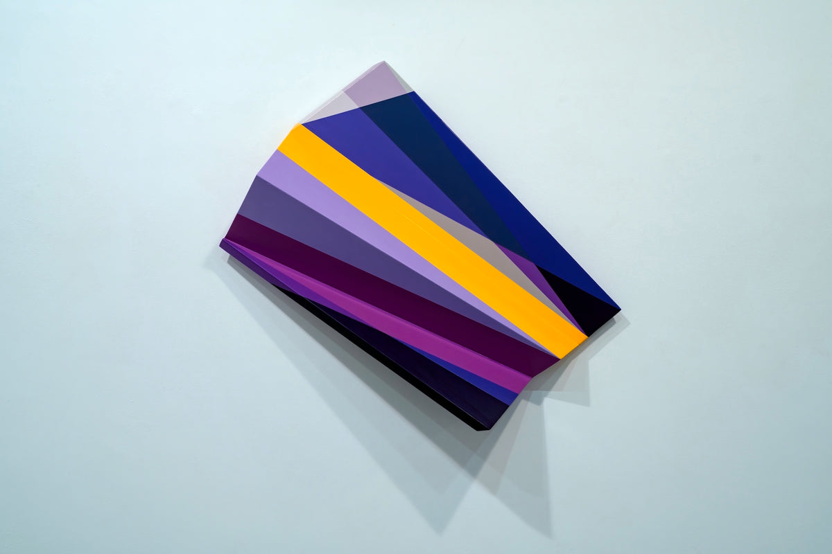 En el trabajo de Rachel Hellmann parece haber, en principio, dos elementos prominentes y claramente distintos que orquestan todo su lenguaje dentro de los estrictos cauces de la abstracción geométrica. Se trata de la línea y el color. Las formas geométricas precisas de Rachel Hellmann remiten a fragmentos de arquitecturas. Se asemejan a retales de construcciones inacabadas, elementos rescatados para albergar el color. Para conseguir esta aparente inmediatez, es necesaria una composición atenta en la que no se ahogue el factor intuitivo, sino que se imponga. La artista vigila con eficacia el ritmo de la exposición, proponiendo un conjunto de obras con una infinidad de ecos entre ellas. El color, repetimos, es el gran protagonista. Su percepción física supera los límites del papel y de la madera para aventurarse en un espacio mucho más amplio. Las líneas rectas y los ángulos, tras una prolongada atención a las esculturas-pinturas y a las pinturas sobre papel, desaparecen. Entre las obras, los colores se mezclan continuamente.