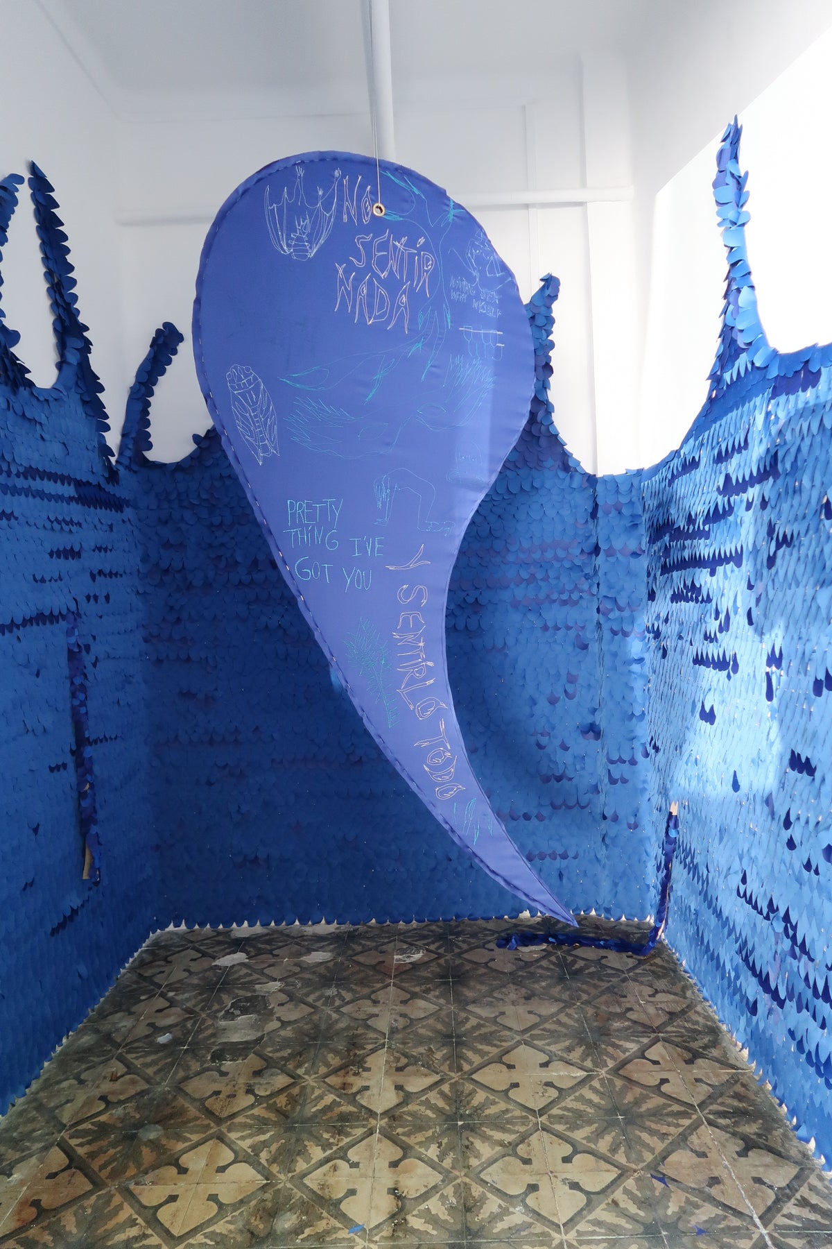 Estos trajes y espacios nos invitan a entrar, a abrazar lo que hemos callado, a recorrer ese camino que nos conduce al autoconocimiento. Gema Polanco en ¨ The alter ego took my hand and brought me here¨ grita, lanza autoconjuros desde lo más profundo de su ser, con todas sus contradicciones. Nos invita a sumarnos, a gritar junto a ella, a remendar y coser nuestras heridas, a atravesarlas, a abrazarlas para finalmente habitarlas. A fundar junt@s los cimientos de una plataforma de lanzamiento cósmica compartida y propia, donde nuevas formas de cuidado -honestas, accesibles y pacíficas- sean posibles. - By Gema *3