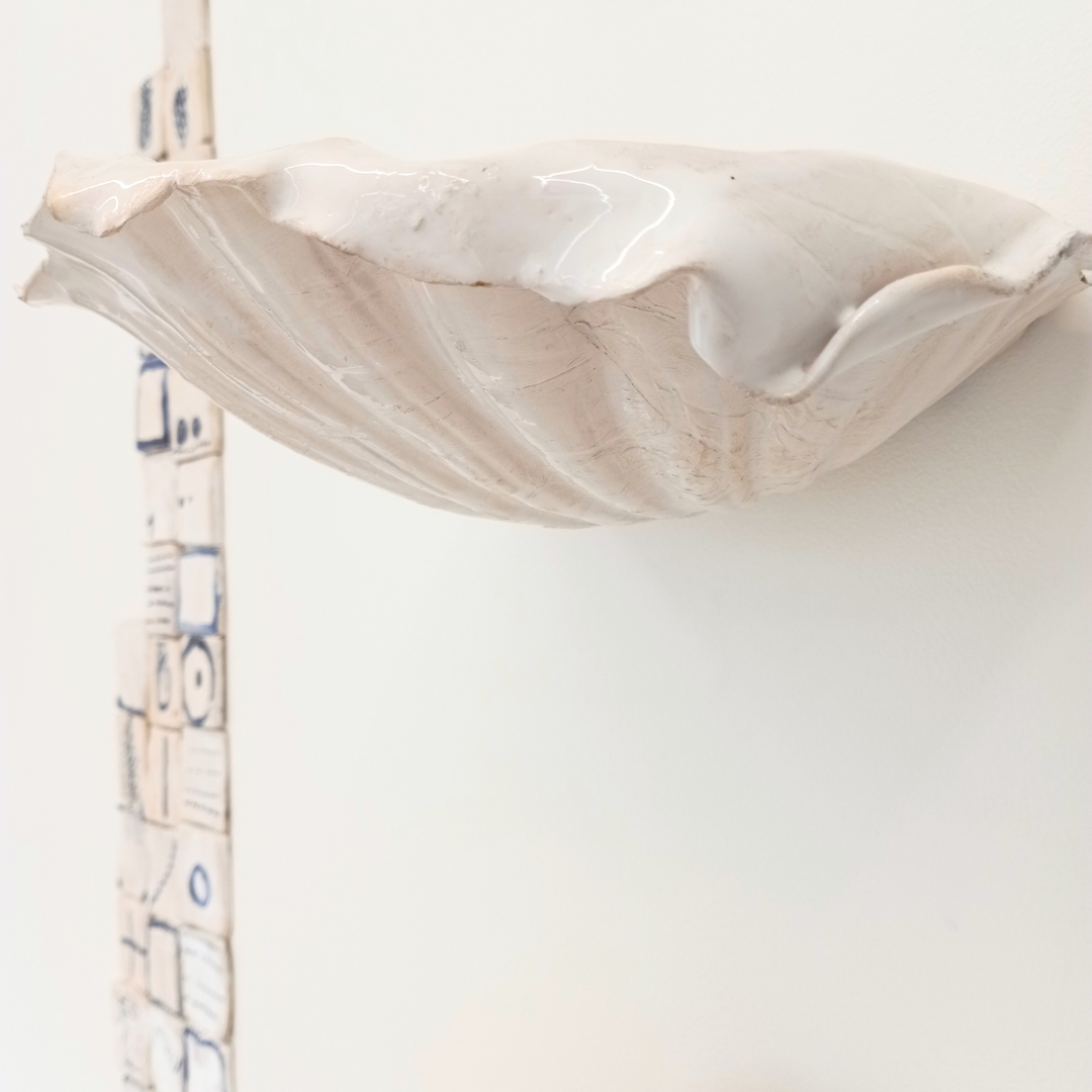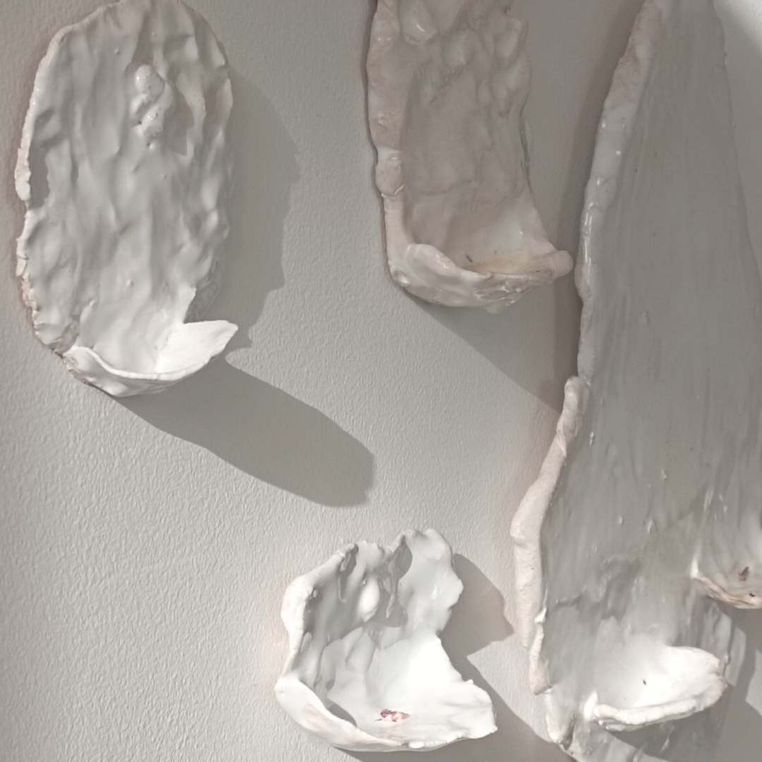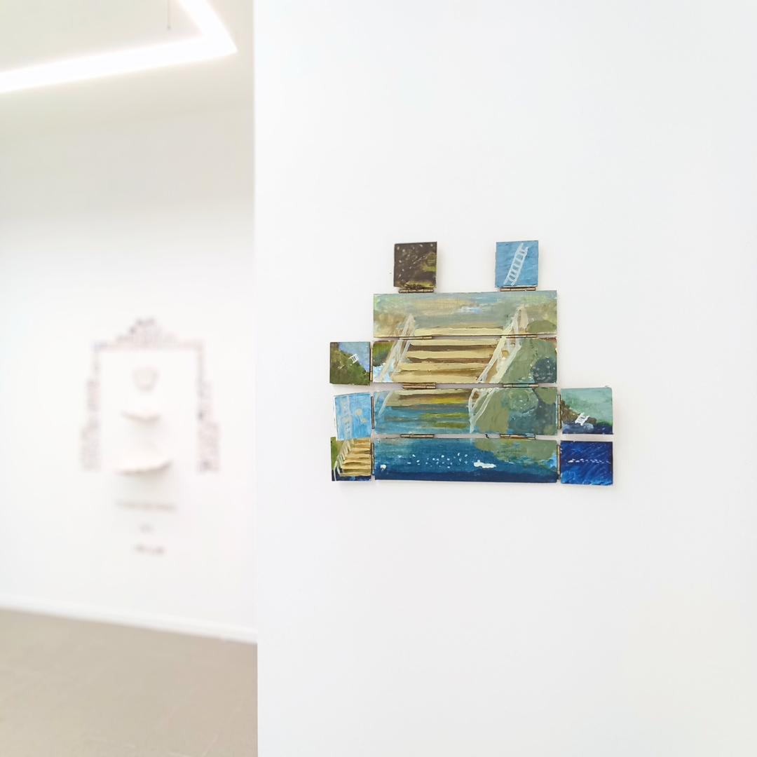 Las benditeras, concavidades cerámicas, parecen reposar en espera de un rito suspendido. Un acto doméstico antes o después del sueño que nunca termina de ocurrir. Las conchas, cavidades testimoniales del agua, son, en este ecosistema reorganizado, reliquias sumergidas. En este oratorio anegado encontramos también varios retablos con volúmenes petrificados, que parecen intuir bajo la superficie el fluir de varios recuerdos, o incluso de alguna imagen oculta.