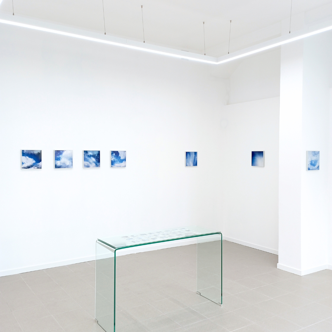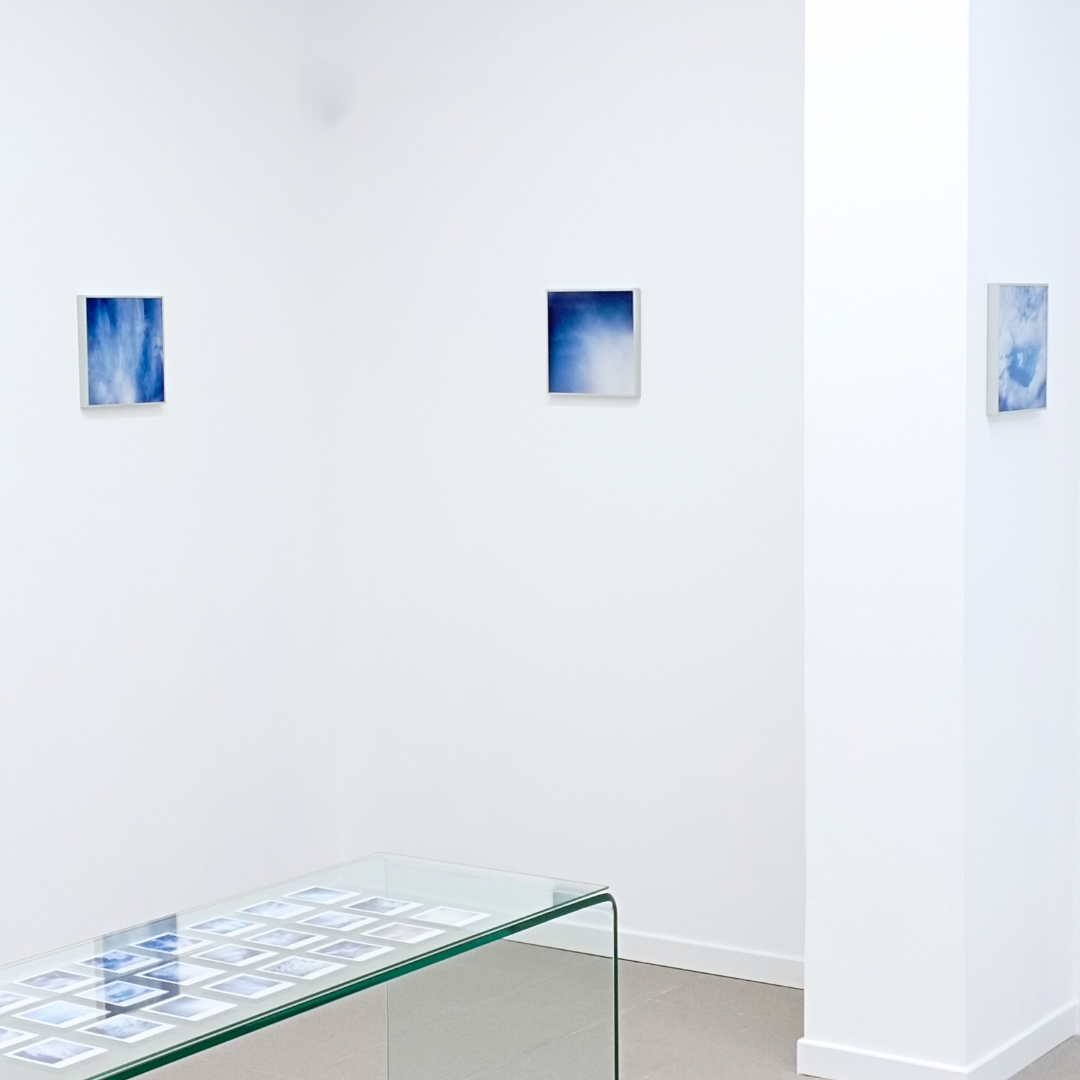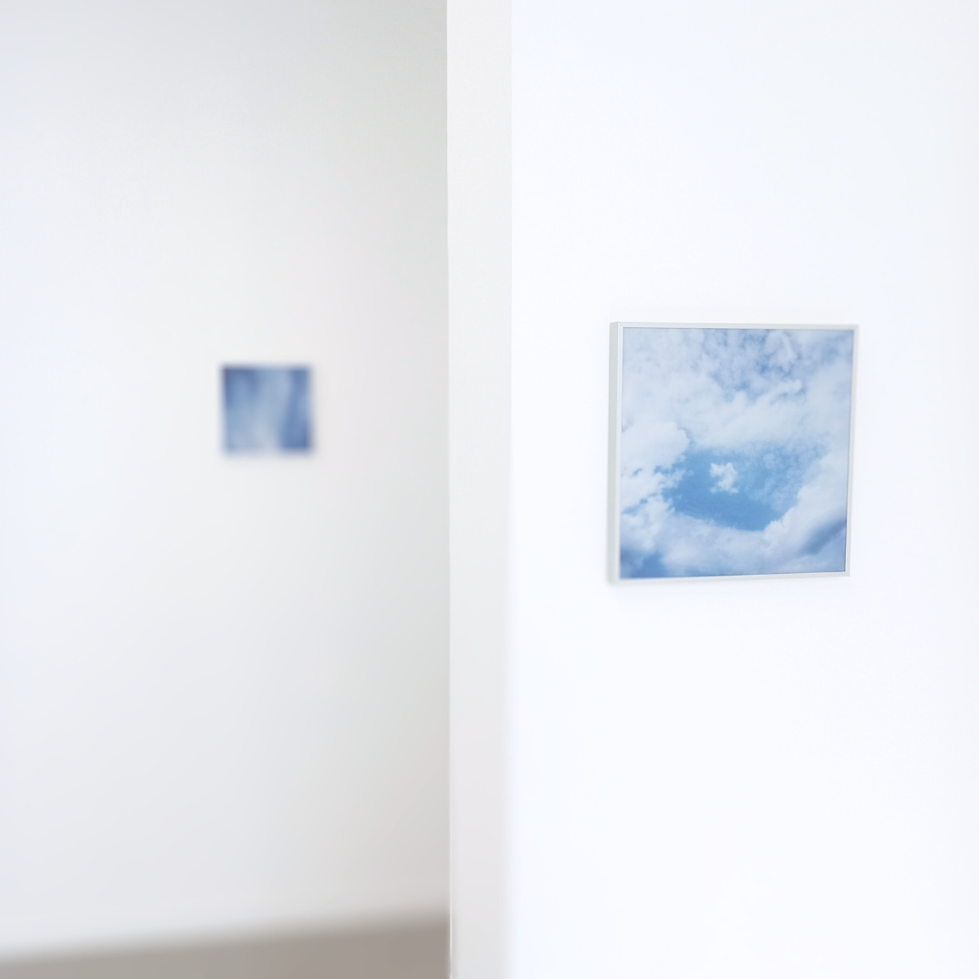 La serie de obras que se presenta en la galería NÉBOA surge de una selección de polaroids de formato diminuto (6 x 6 cm) que, paradójicamente, intenta abarcar lo inabarcable: la inmensidad del cielo.