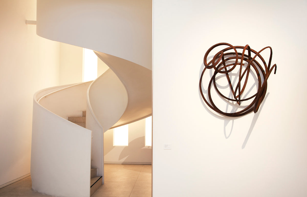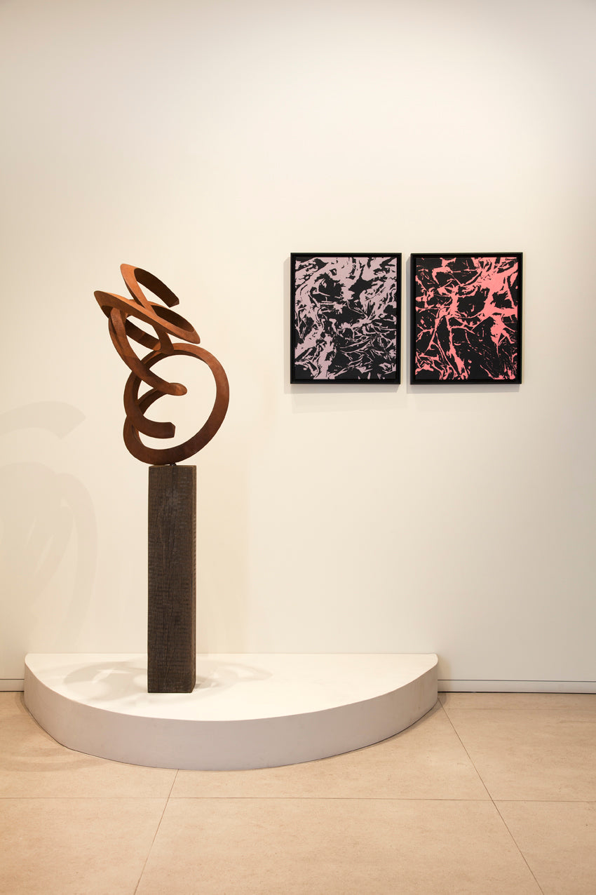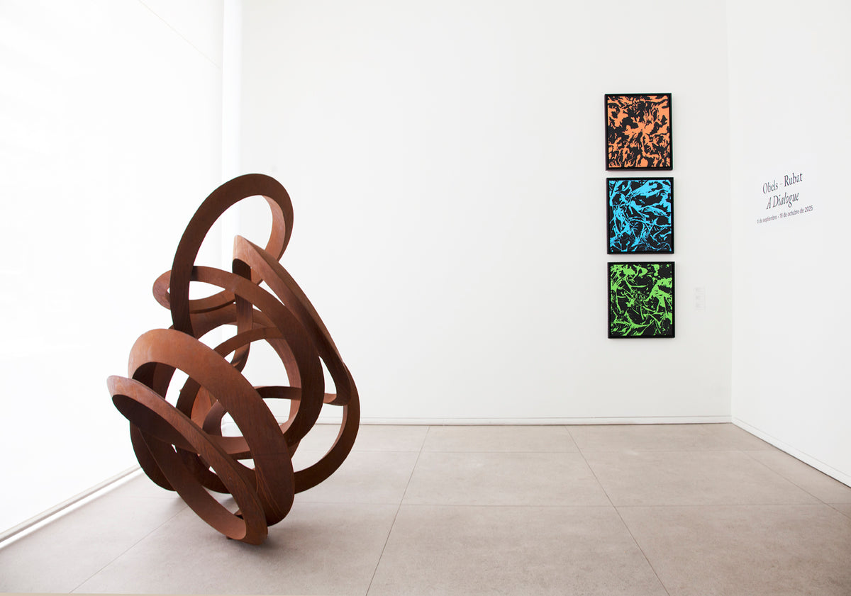 Por su parte, Obels aprovecha la oxidación natural del acero corten, transformando una materia industrial en algo fluido, ingrávido y vibrante. Sus obras se muestran sorprendentemente ligeras, con formas sinuosas, como cintas, que se retuercen y flotan en el espacio, desafiando la solidez de su propio peso. La práctica escultórica de Obels puede considerarse como una meditación sobre el equilibrio, la tensión y la ilusión del movimiento. La exposición también incluye una selección de obras sobre papel de Obels, las cuales reflejan su interés por la forma y la escultura desde una perspectiva bidimensional.