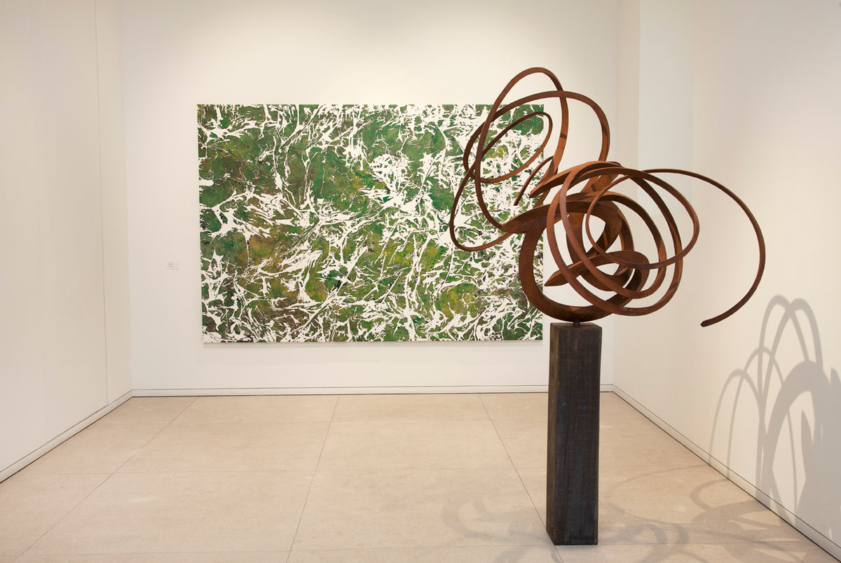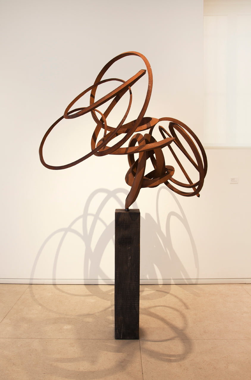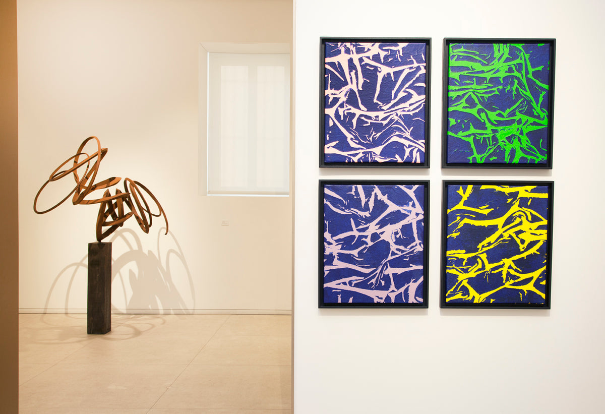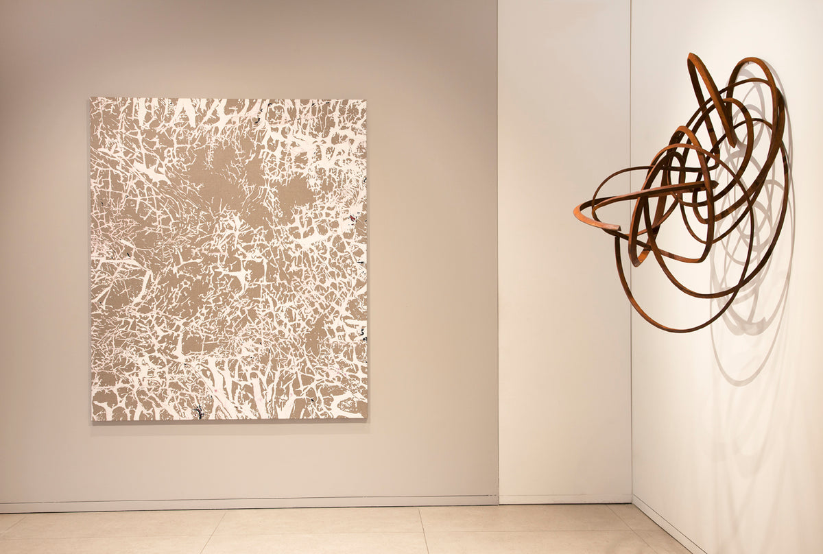 Por su parte, Obels aprovecha la oxidación natural del acero corten, transformando una materia industrial en algo fluido, ingrávido y vibrante. Sus obras se muestran sorprendentemente ligeras, con formas sinuosas, como cintas, que se retuercen y flotan en el espacio, desafiando la solidez de su propio peso. La práctica escultórica de Obels puede considerarse como una meditación sobre el equilibrio, la tensión y la ilusión del movimiento. La exposición también incluye una selección de obras sobre papel de Obels, las cuales reflejan su interés por la forma y la escultura desde una perspectiva bidimensional.