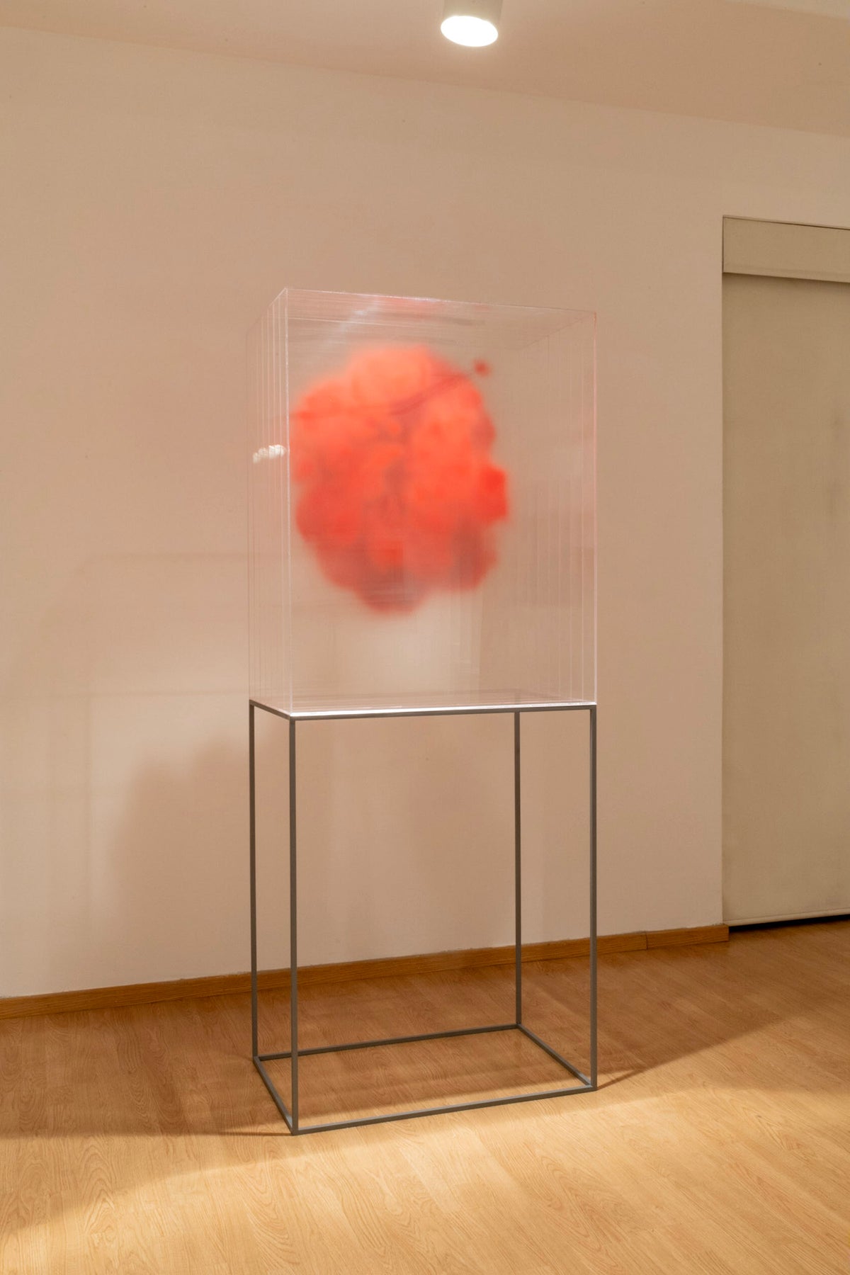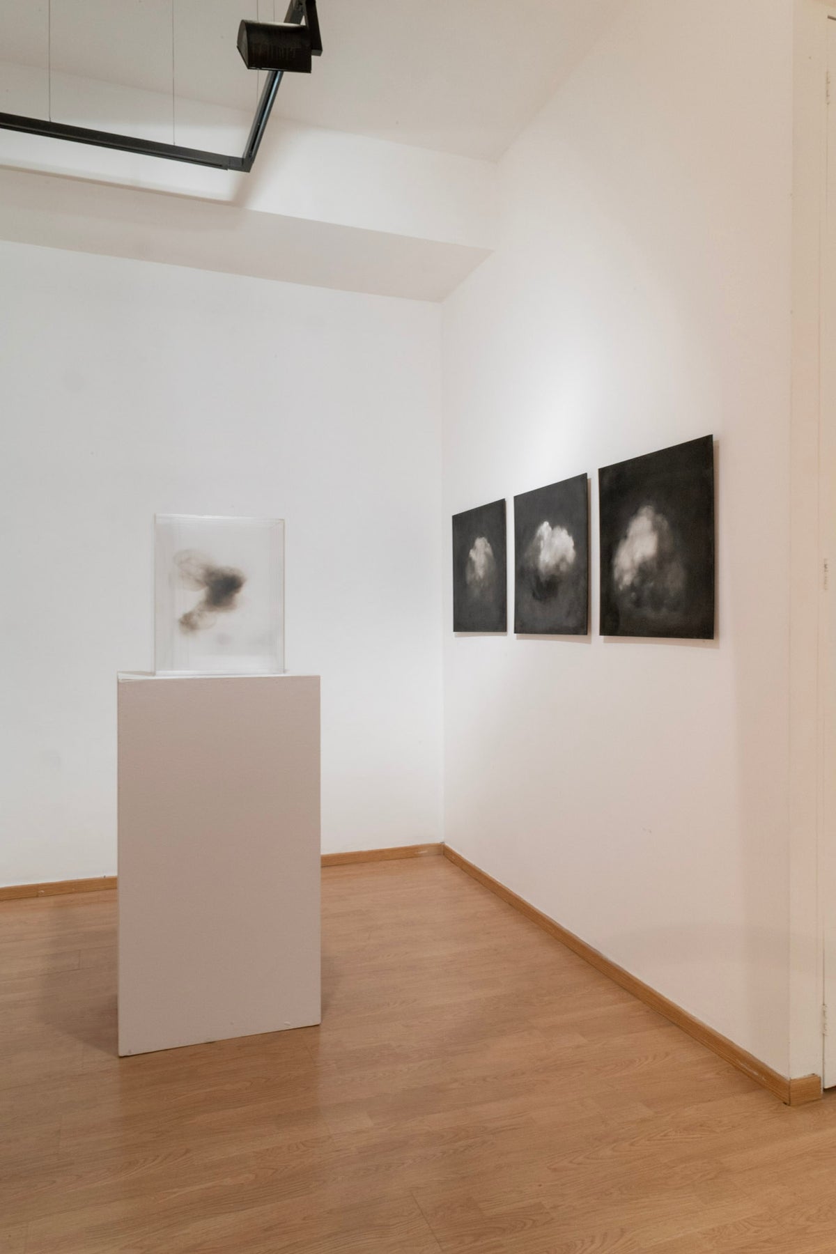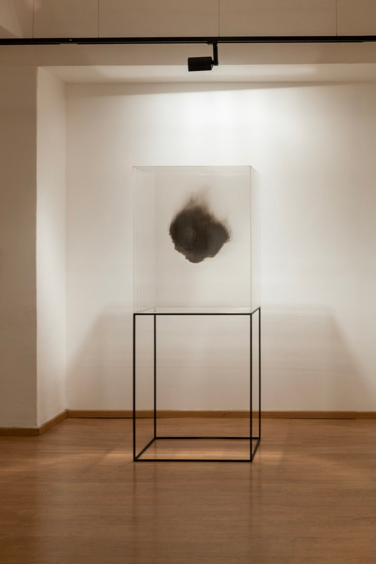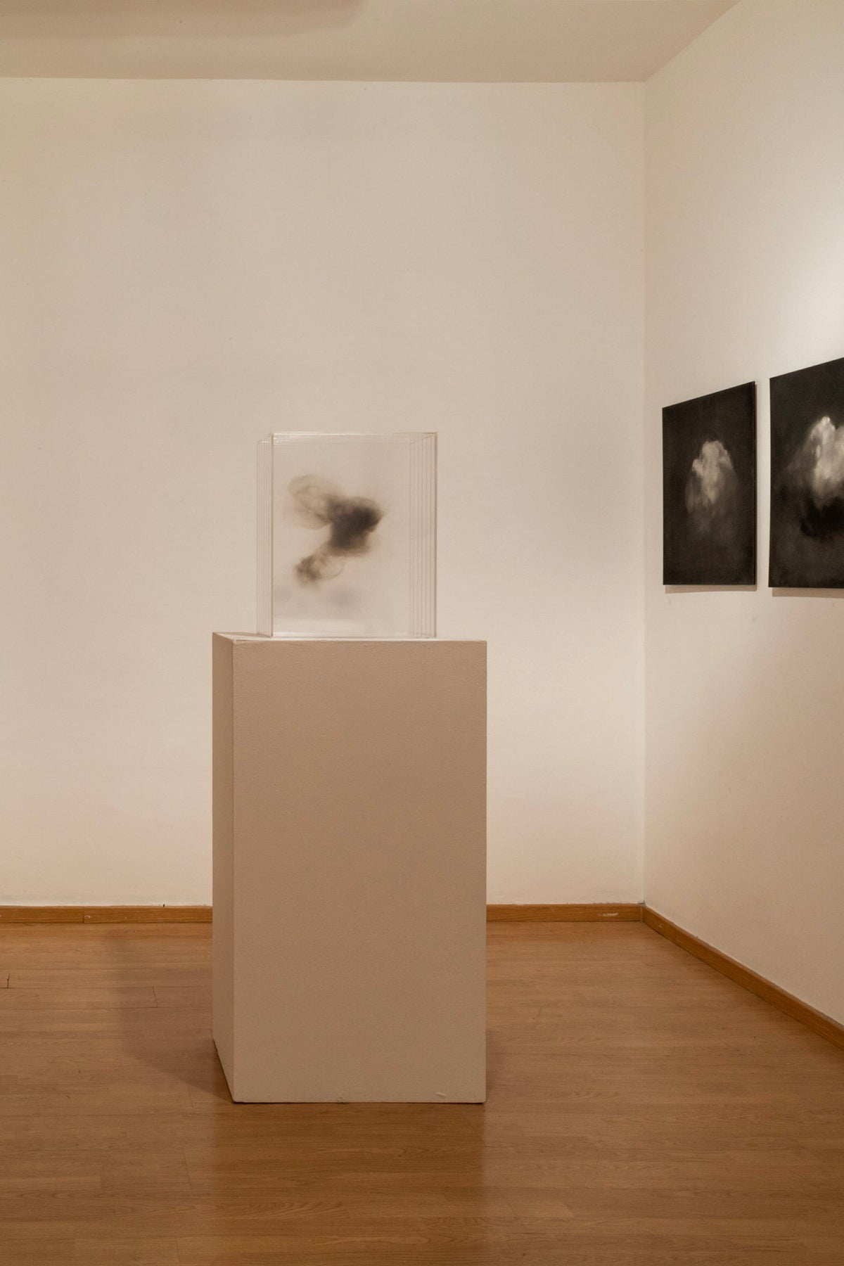Isabel Alonso Vega juega con la materialidad de lo intangible, sus piezas son una cuasi taxidermia de los pensamientos, los cuales son representados a través de nubes de humo que podrían solo existir en nuestra mente. Las piezas están conformadas por láminas bidimensionales que al unirse dan como resultado un efecto de profundidad y tridimensionalidad avivando esa oscura figura abstracta. La intensa materia de color negro, y algunas otras veces de color rojo, flota dentro de lo que parece una pecera de acrílico transparente.