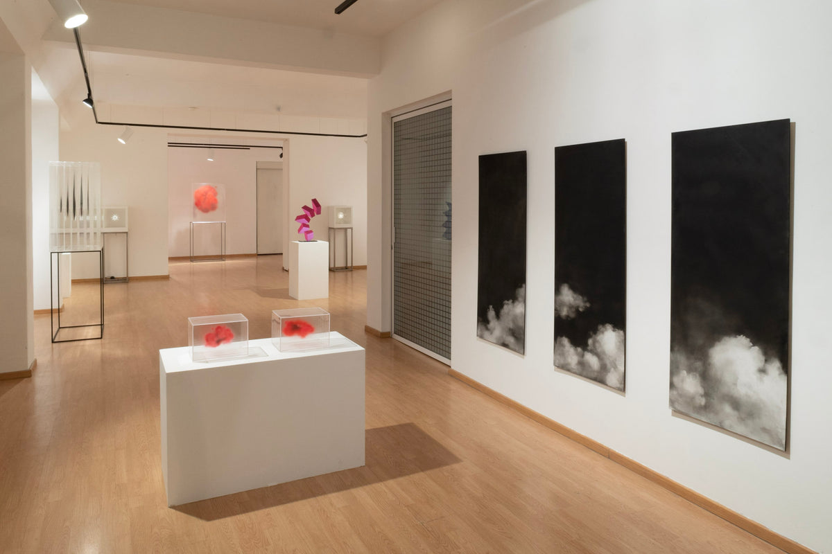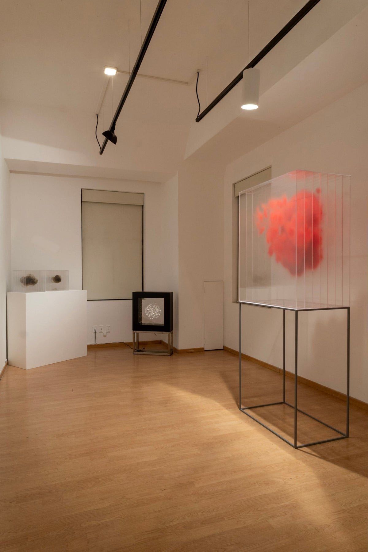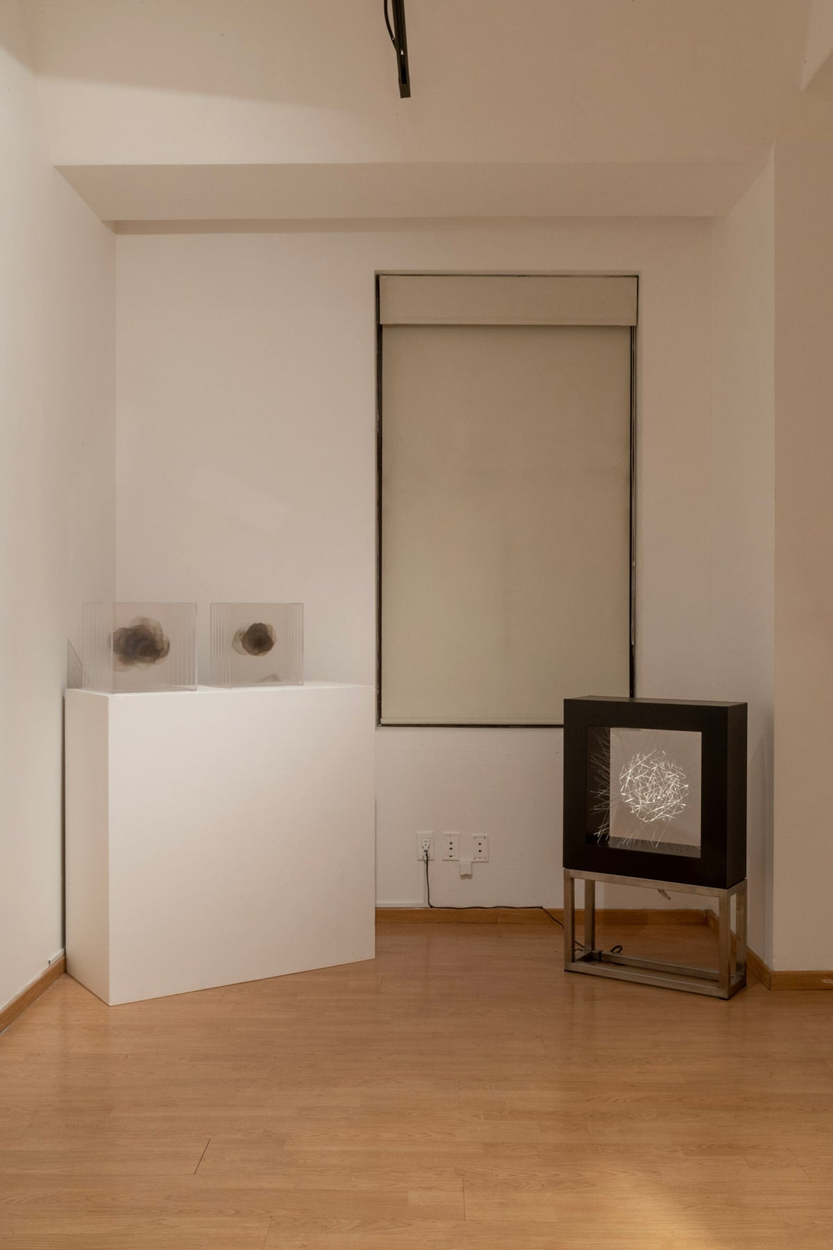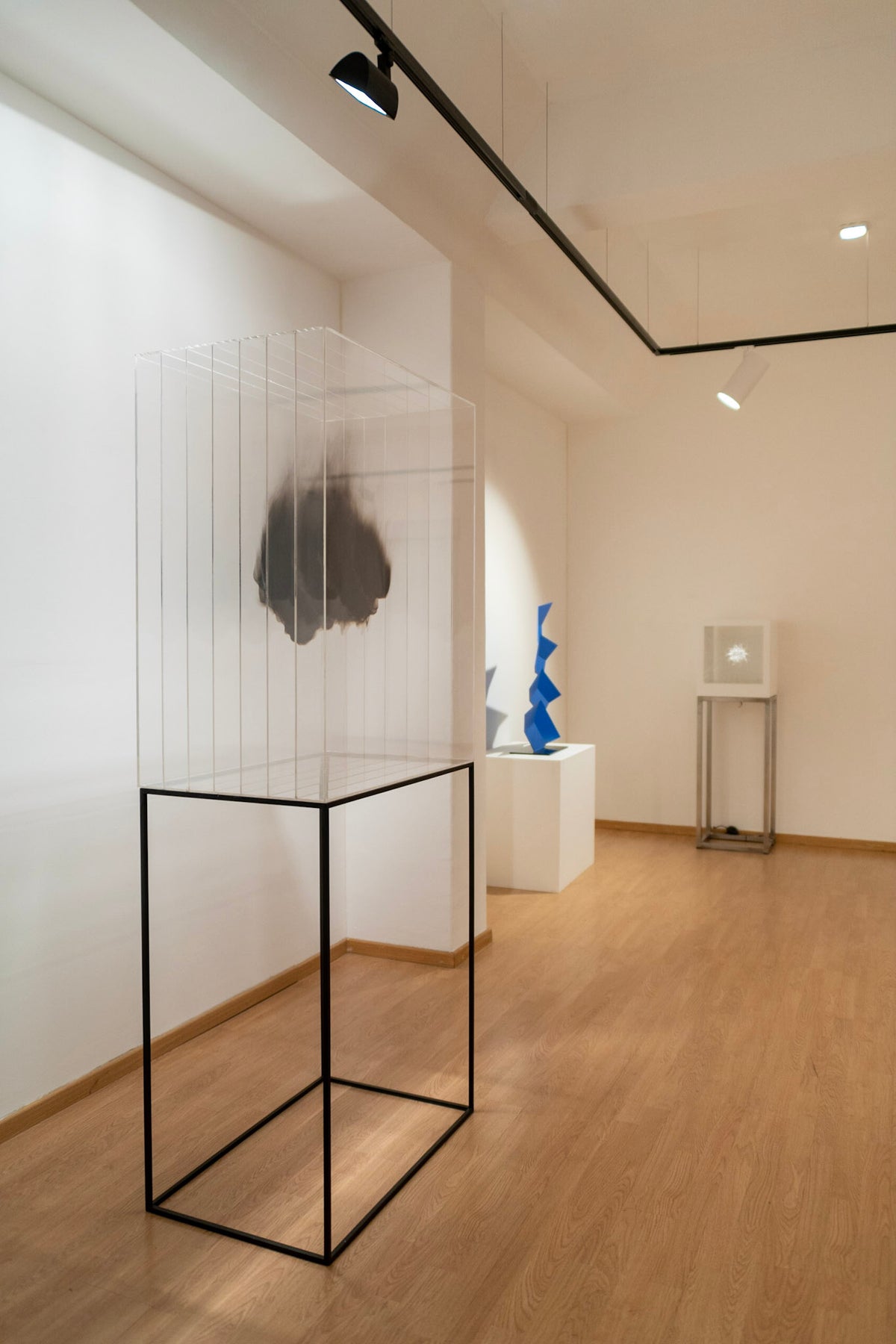 Isabel Alonso Vega juega con la materialidad de lo intangible, sus piezas son una cuasi taxidermia de los pensamientos, los cuales son representados a través de nubes de humo que podrían solo existir en nuestra mente. Las piezas están conformadas por láminas bidimensionales que al unirse dan como resultado un efecto de profundidad y tridimensionalidad avivando esa oscura figura abstracta. La intensa materia de color negro, y algunas otras veces de color rojo, flota dentro de lo que parece una pecera de acrílico transparente.