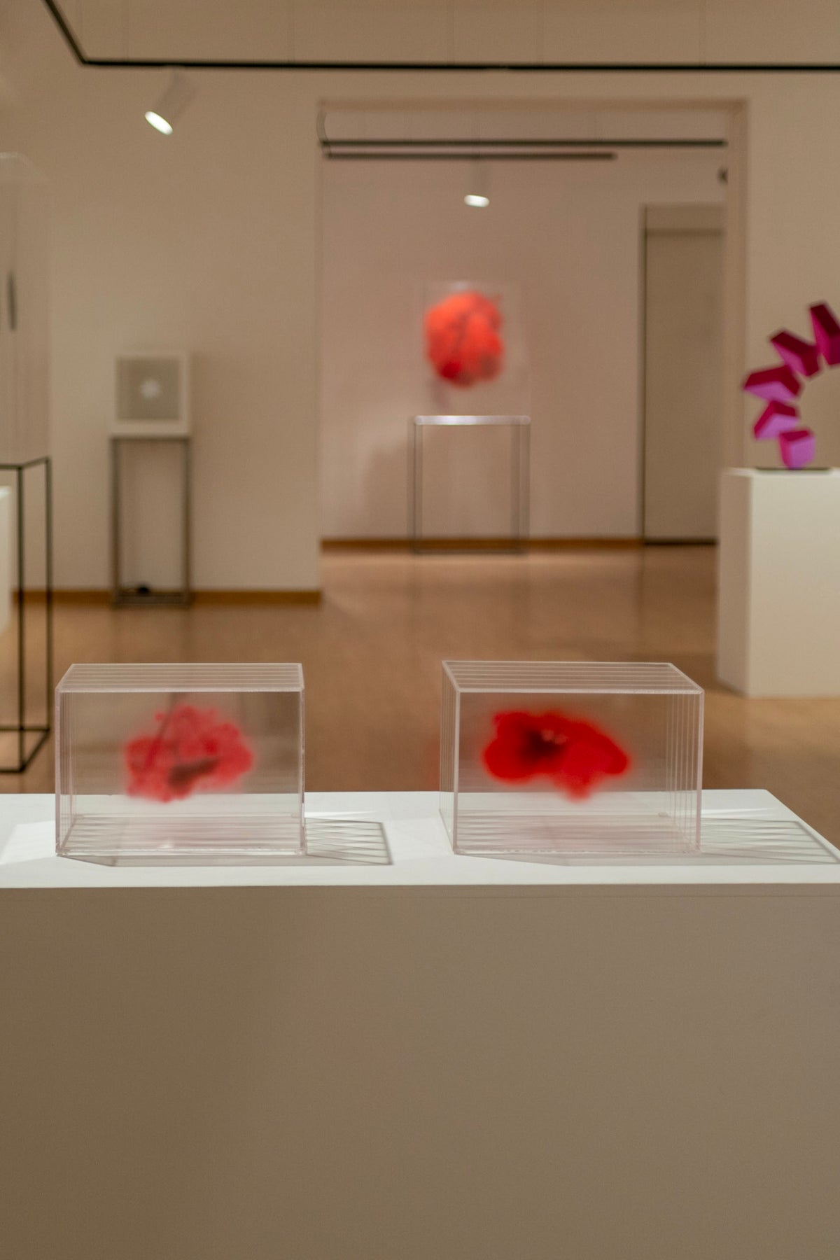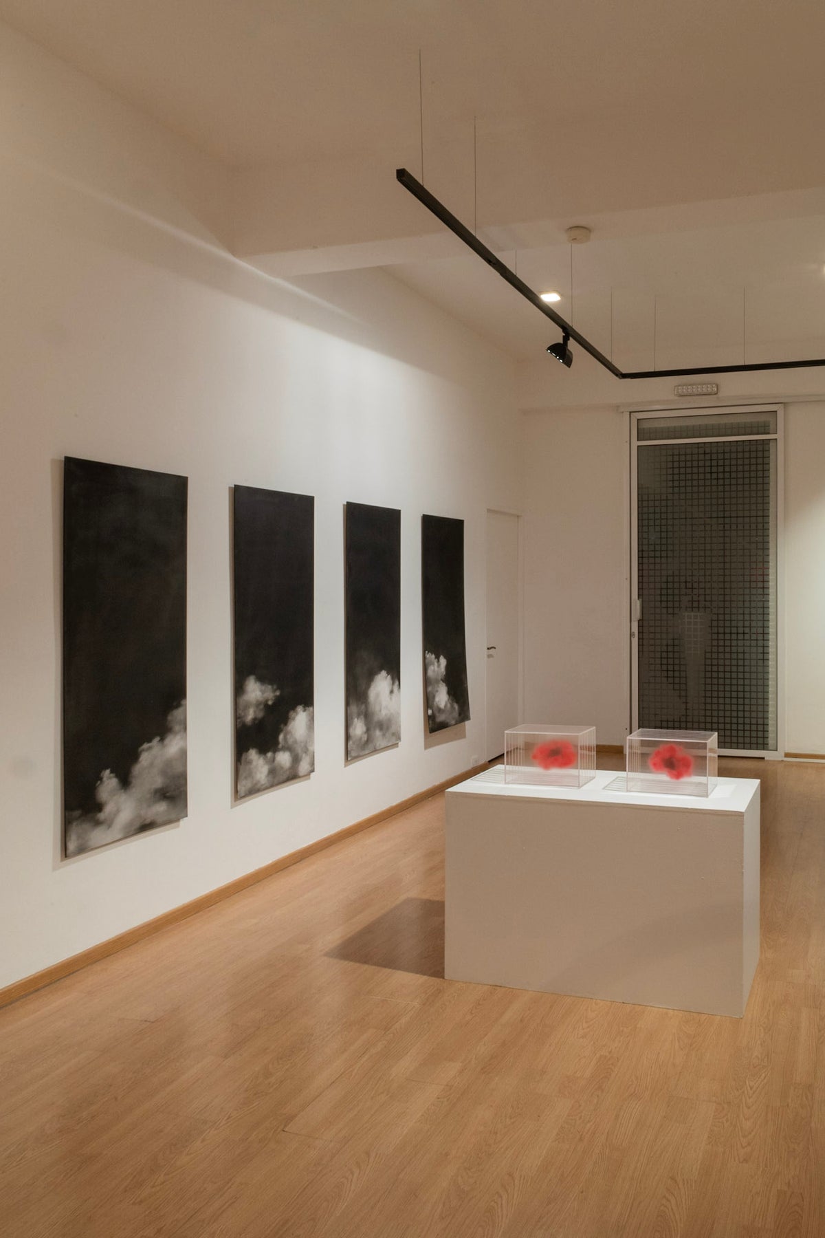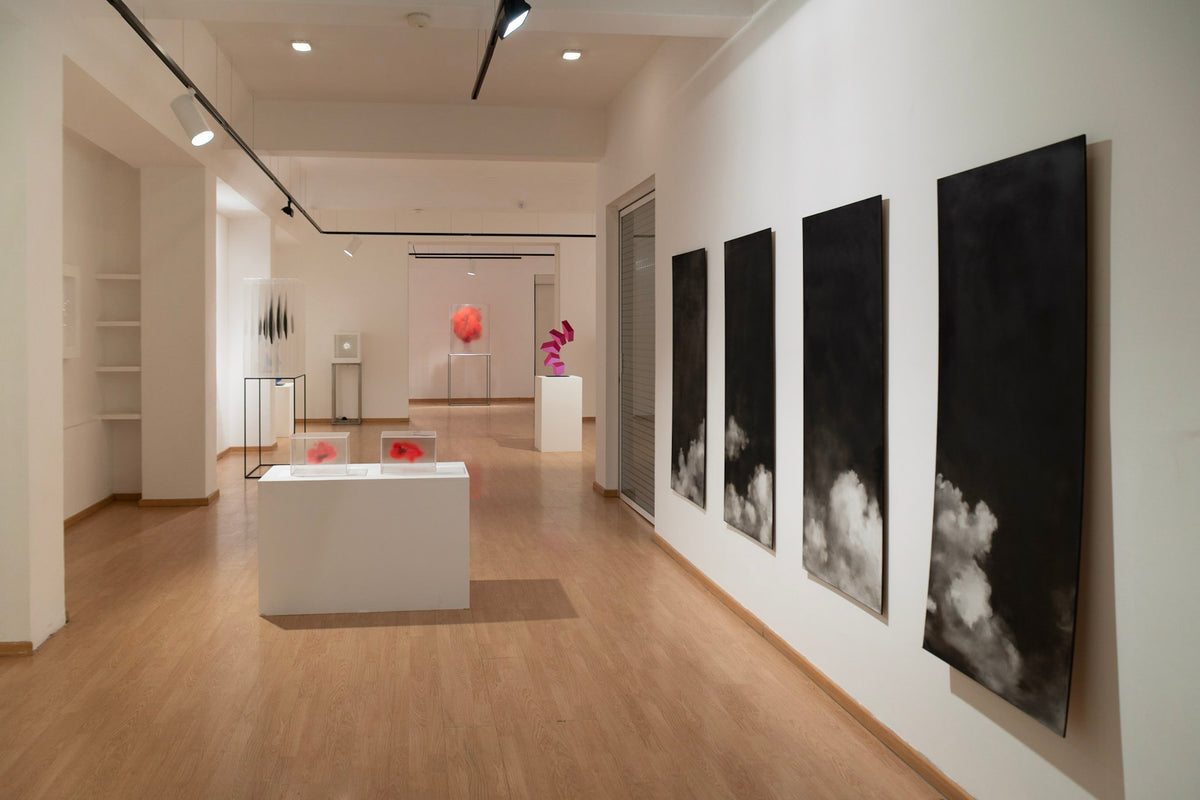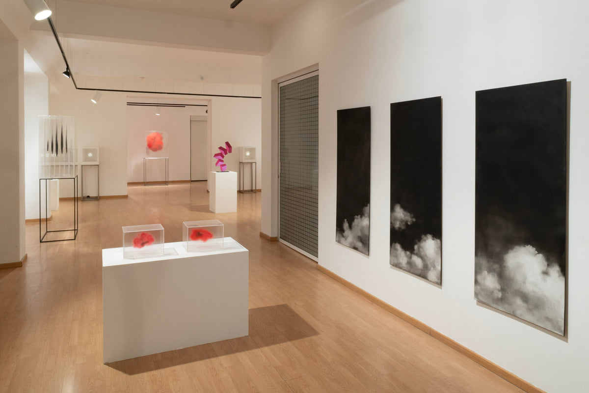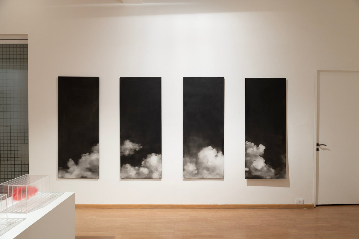 Isabel Alonso Vega juega con la materialidad de lo intangible, sus piezas son una cuasi taxidermia de los pensamientos, los cuales son representados a través de nubes de humo que podrían solo existir en nuestra mente. Las piezas están conformadas por láminas bidimensionales que al unirse dan como resultado un efecto de profundidad y tridimensionalidad avivando esa oscura figura abstracta. La intensa materia de color negro, y algunas otras veces de color rojo, flota dentro de lo que parece una pecera de acrílico transparente.