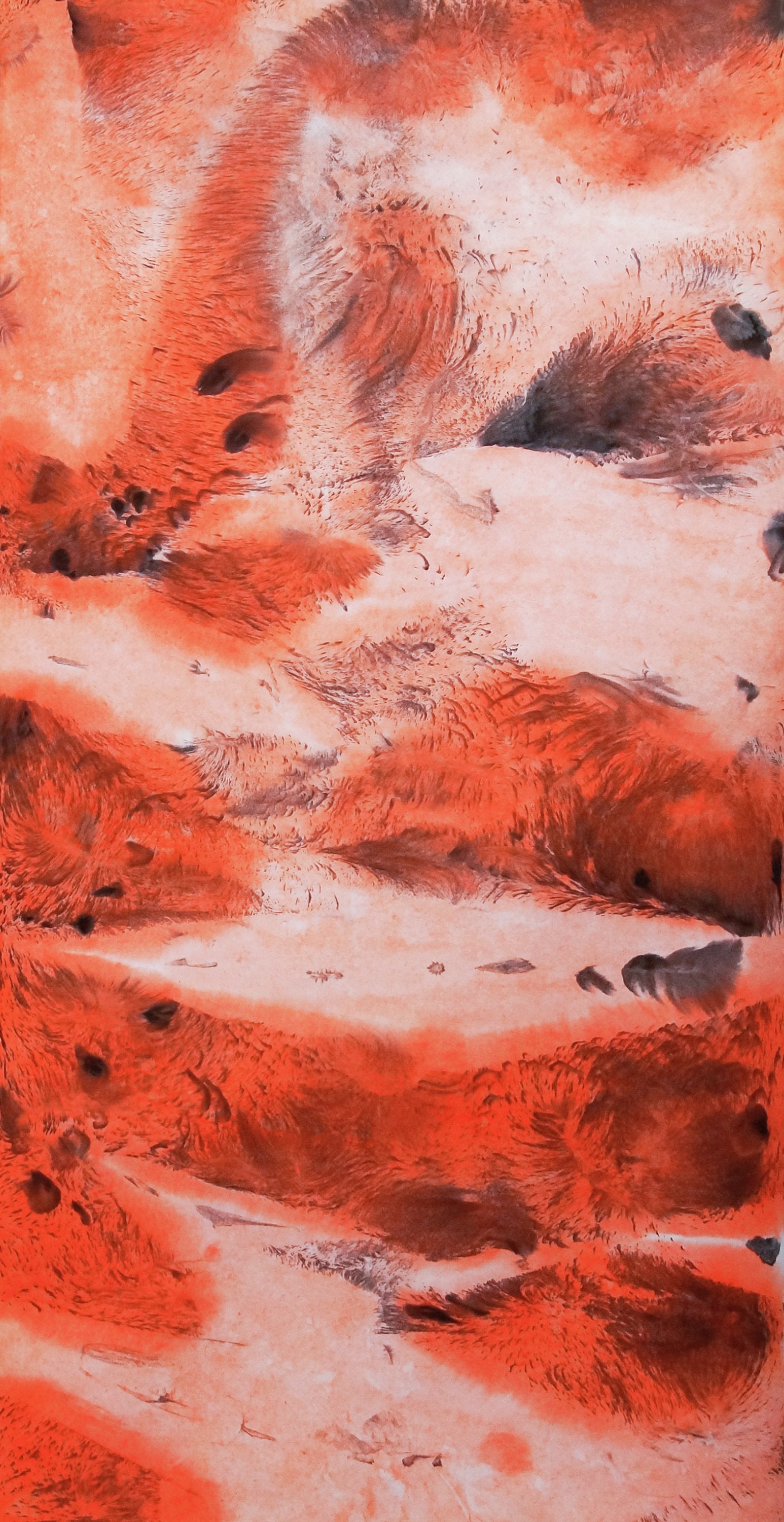 Los trabajos de la artista argentina parten de una investigación sobre materiales naturales, papeles, pigmentos y escenografías que emplea en instalaciones site-specific y contextos de integración social y sostenible. Mediante fibras vegetales, tintas, acuarelas, hilos y alfileres suele realizar composiciones volumétricas que exploran el contacto físico del espectador con la obra y las relaciones plásticas que ponen en valor las conexiones simbólicas, cromáticas y táctiles de diversas culturas del mundo. Con el protagonismo del quipu precolombino —instrumento para el registro de información mediante cuerdas, tejidos, nudos y colores— la artista reivindica aspectos narrativos, sostenibles y performativos de las capacidades cromáticas y texturales de los materiales que usa, para proponer experiencias en torno a la pervivencia cultural. Rago, en concreto, nos invita a leer con las manos y tantear una historia a través de los colores, la orientación de los nudos, el grosor o el anclaje de las cuerdas de sus instalaciones. Mientras que, en sus series pictóricas, el método de Rago proviene del azar y la aceptación de los movimientos, permitiendo que los borrones, las manchas, las salpicaduras y las estelas de tinta sean absorbidas por los papeles Tengujo o Xuan que utiliza, parecidos a finas telas que dejan pasar suavemente la luz. Son estas prácticas involuntarias las que le permiten trabajar en serie, saltando de obra en obra, sin dar cabida a las búsquedas racionales y los pretextos, en un trabajo de apertura hacia lo inesperado.