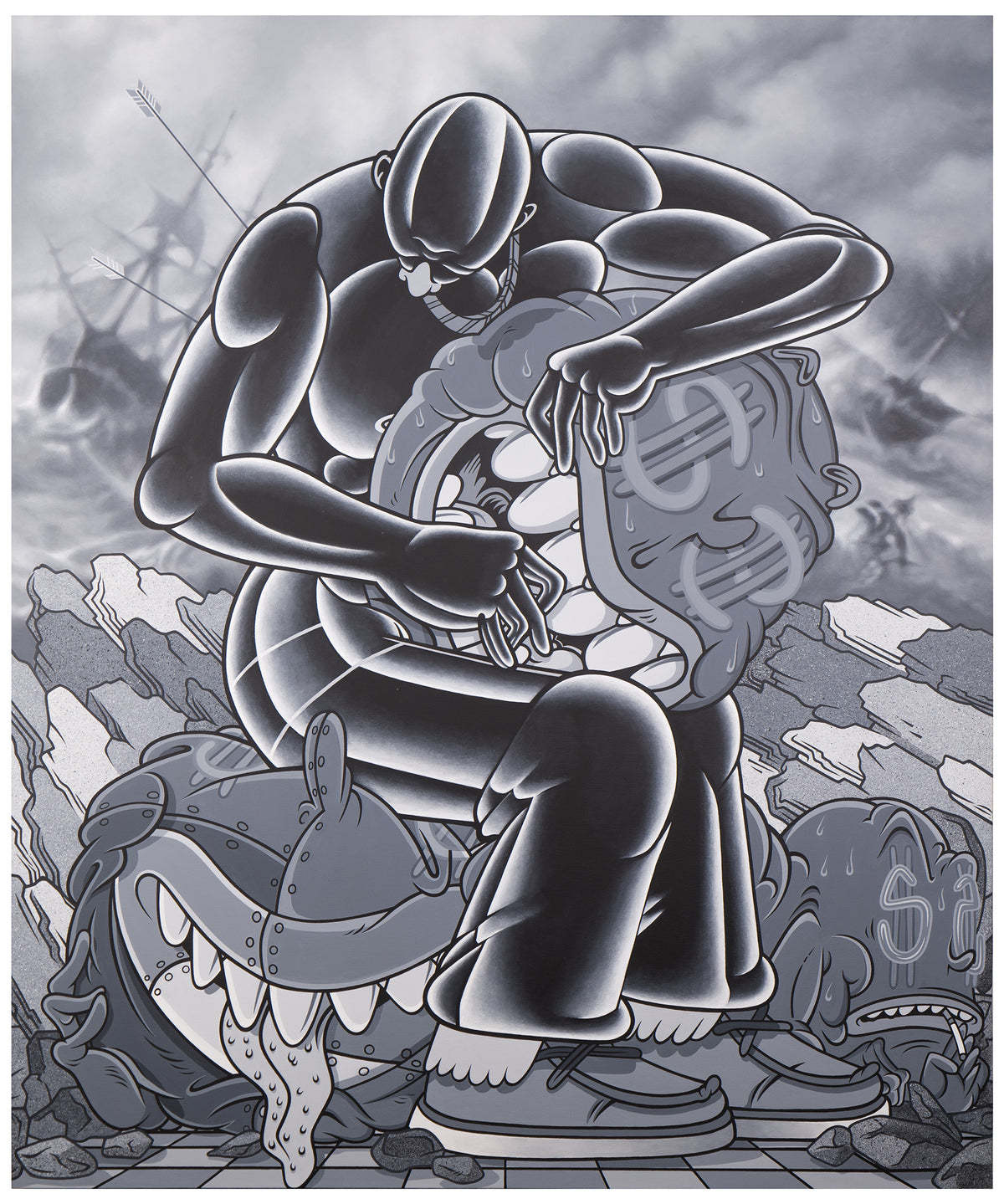 Esta exposición ofrece una mirada crítica a los mundos que estos artistas habitan e interrogan. Juntos, abren un diálogo sobre los símbolos del poder—las marcas, el dólar, la nación—desmantelándolos con una combinación subversiva de inteligencia y humor que se niega a olvidar la esperanza.
