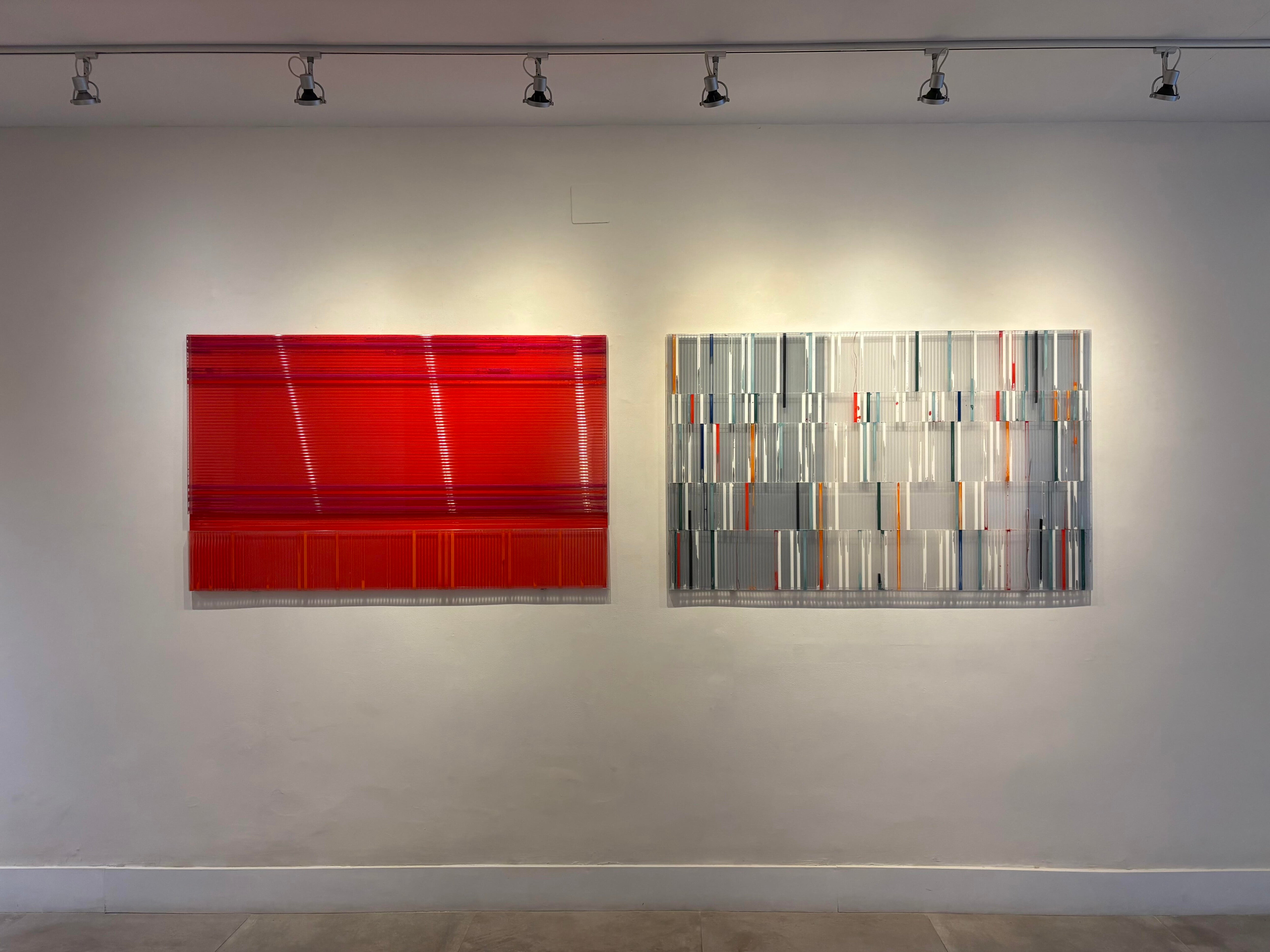El prefijo trans —“al otro lado, a través de, más allá”— actúa como clave conceptual en su trabajo. En este contexto, la retícula de policarbonato celular que utiliza como soporte no es un mero material: se convierte en un pentagrama visual, donde los colores, las transparencias y las formas vibran como notas de una partitura convertida en imagen.