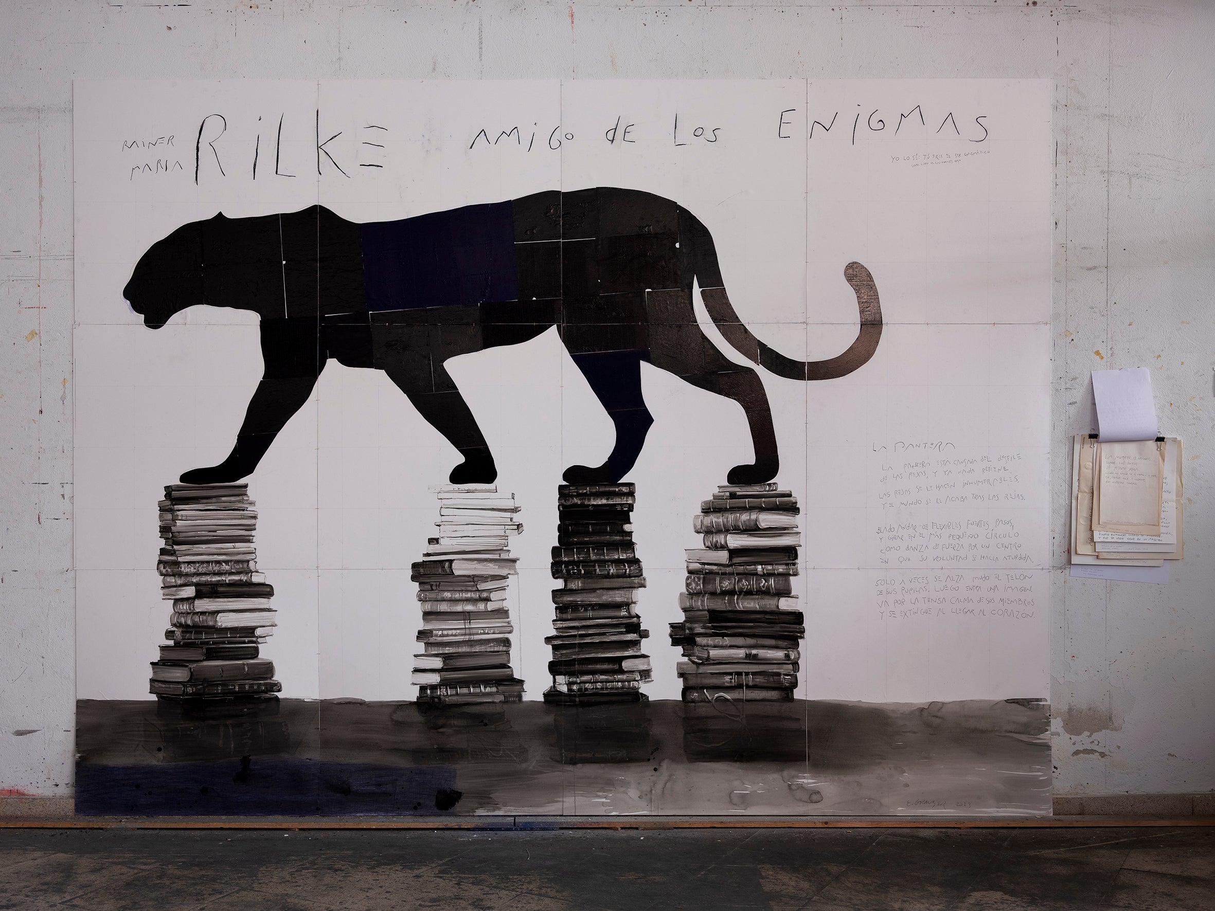El stand se articula en torno a una pieza de gran formato titulada “Rilke amigo de los enigmas”, realizada expresamente para este project, y que de alguna manera es el complemento de la exposición que EDUARDO GRUBER presentó en la galería el pasado mes de febrero de este mismo año; Una potente exposición construida con 16 acuarelas de pequeño formato pertenecientes a la serie “El largo camino al paraíso”, que fueron pintadas en aquellas largas y tórridas tardes del verano del 2022.
