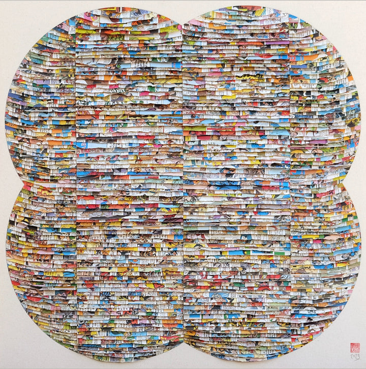 Papel de cómic rasgado a mano y pegado sobre tela enmarcado en caja de metacrilato