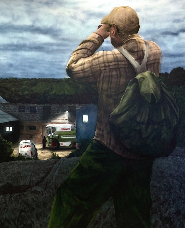 Aunque parece seguir la senda trazada por los pintores de género de hace siglos, Martin introduce significantes detalles que alejan su obra de la simple representación de aspectos de la vida cotidiana. Al sustituir el plein air por capturas de pantalla del video juego antes mencionado, Kačmarek trabaja con fondos más universales, ya preparados y envueltos en una luz y una atmósfera evocadoras. Al mismo tiempo, mantiene su interés inicial por la representación de entornos concretos y sus matices. Llevando su intensidad a la esfera cinematográfica, las escenas de granjeros furtivos que espían a sus vecinos, sabotean los esfuerzos de los demás o se enfrentan a circunstancias desafortunadas, se hacen más reales y relatables. La atmósfera de traición e intriga se acentúa aún más con una serie de obras sobre papel al estilo de Richter, que representan detalles particulares, en su mayoría técnicos, de herramientas y máquinas. Así, en lugar de crear obras sobre la naturaleza humana o hablar de psicología del comportamiento, la atención se centra en un determinado grupo demográfico y sus rituales, hábitos o costumbres particulares. Pero sólo como argumento que conecta los paisajes y las escenas rurales que al artista le interesa retratar. Para transmitir la sencillez real de la vida en la granja, las imágenes se renderizan con un cierto grado de realismo, manteniendo su autenticidad y suciedad. Trabajando casi exclusivamente con el aerógrafo, las finas capas de pintura acrílica transmiten los fertiles terrenos marcados por el trabajo y la intemperie. Familiarizado con el tema y comprometido en exponer las arduas tareas rurales, Kačmarek rinde homenaje a esta actividad esencial y a las duras vidas de quienes la practican, al tiempo que hace guiños ocasionales a aspectos un tanto absurdos. Criticando la codicia, la envidia y los aspectos competitivos, revela su aprecio por los métodos de “no hacer nada” desarrollados por el filósofo y agricultor japonés Masanobu Fukuoka. En última instancia, su revelación del lado turbio de la agricultura puede verse como una metáfora para promover un estilo de vida más armonioso en sintonía y coexistencia con los demás y con los principios de la naturaleza.