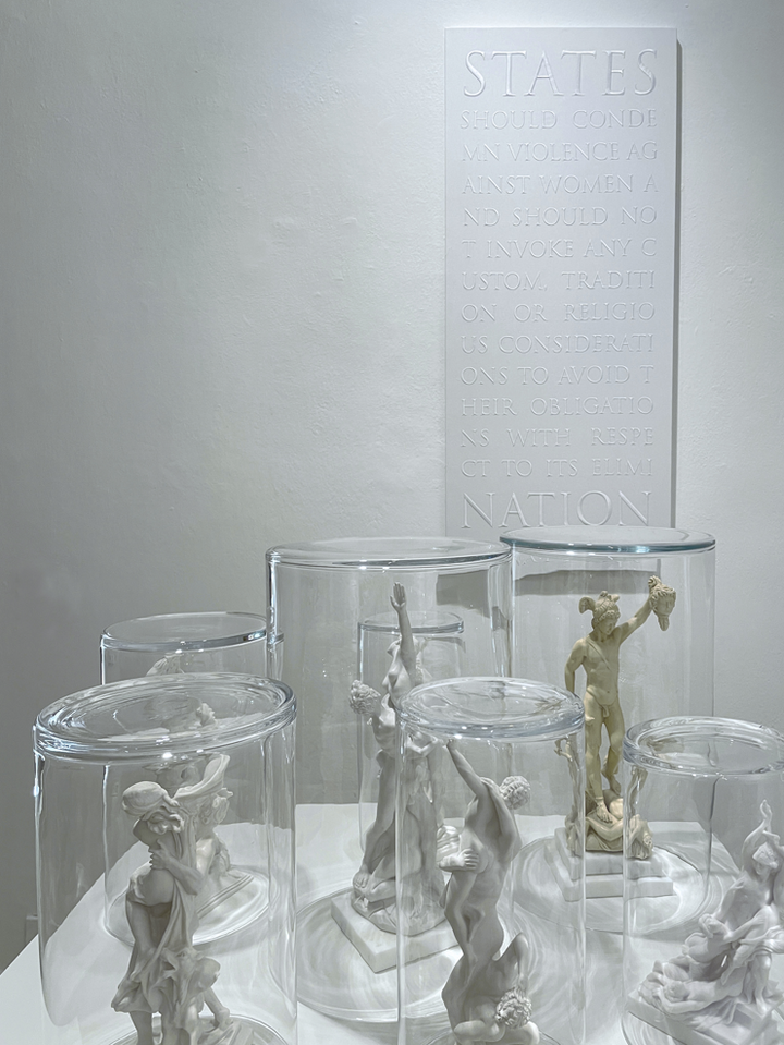7 reproducciones de esculturas clásicas (resina y mármol), vidrio y 1 bordado con hilo blanco sobre algodón montado en bastidor.