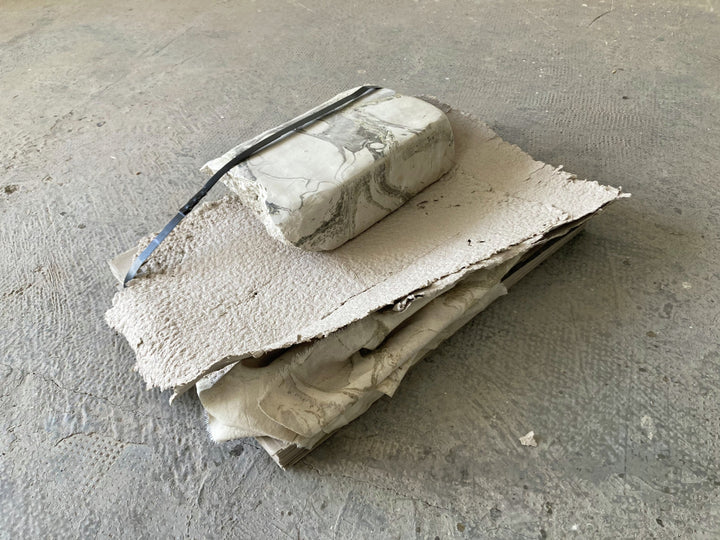 Fleje de acero, papel de cartón piedra, y arcilla con gesmonite, cartón piedra y tela de algodón marmoleados con acuarela.