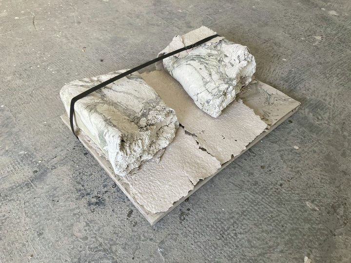 Fleje de acero, papel de cartón piedra, y arcilla con gesmonite, cartón piedra y tela de algodón marmoleados con acuarela.