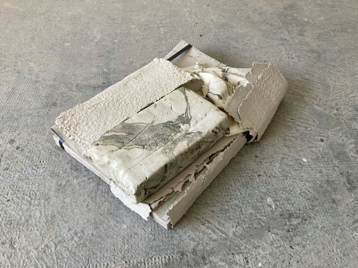 Fleje de acero, papel de cartón piedra, y arcilla con gesmonite, cartón piedra y tela de algodón marmoleados con acuarela.