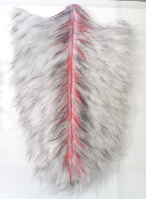 Tela peluda blanca con pintura roja y gris