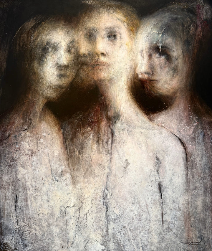 Tres figuras femeninas que se imponen. La pincelada disuelve formalismos en abstracciones sin aviso previo.