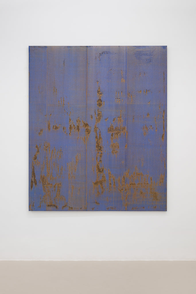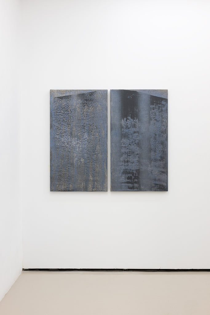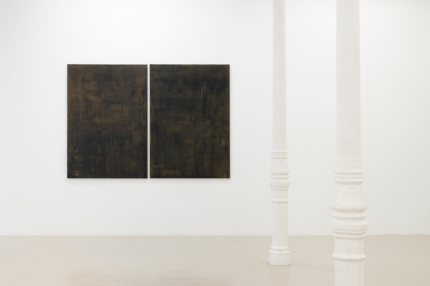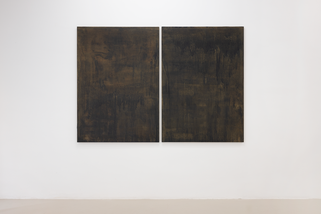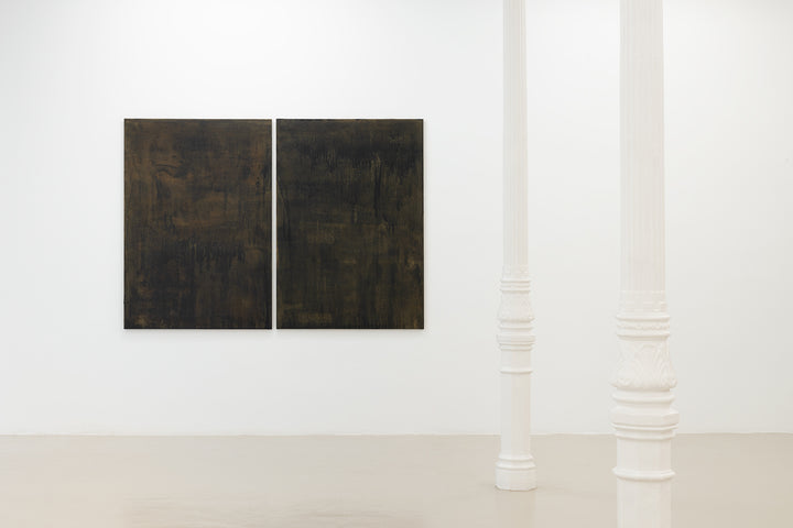 Desde esa idea de umbral, Peirao el cuadro, se construye a partir de un diálogo entre la horizontalidad longitudinal del formato y la verticalidad en la aplicación de la pintura, con un ritmo de derecha a izquierda marcado por diferentes cesuras. Tal como señalaba Hölderlin en su lectura de la tragedia griega, la cesura no es una pausa pasiva, sino una interrupción que intensifica; un vacío que reorganiza el tiempo y concentra el sentido. Negro también reconoce otra resonancia conceptual durante el proceso: el ciclo Treatise on the Veil de Cy Twombly, cuyos grafismos y líneas horizontales de tiza blanca despliegan la pintura como una partitura abierta.