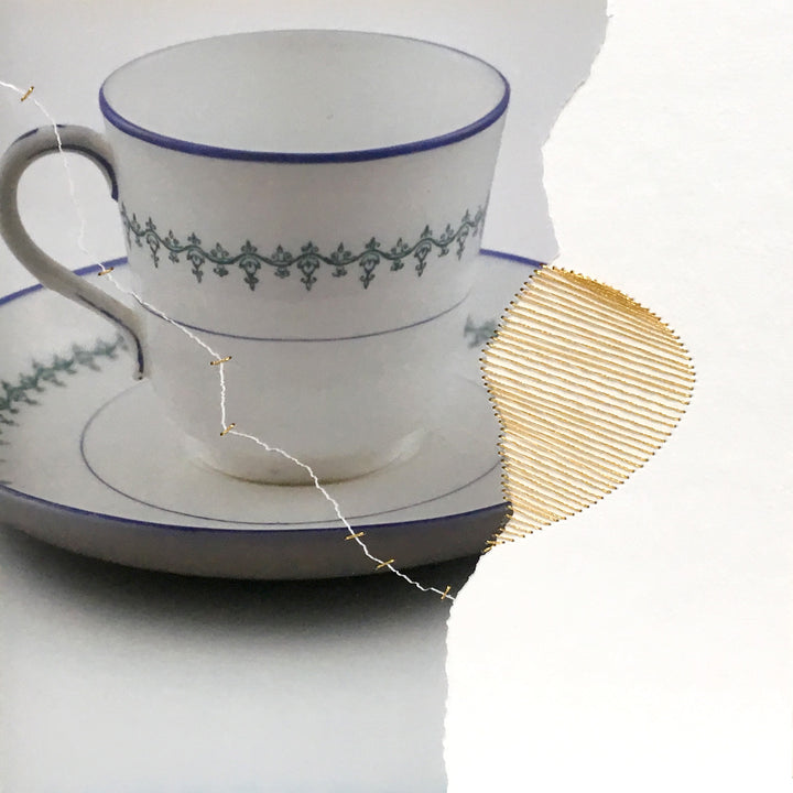 Fotografía rasgada y suturada con hilo de oro