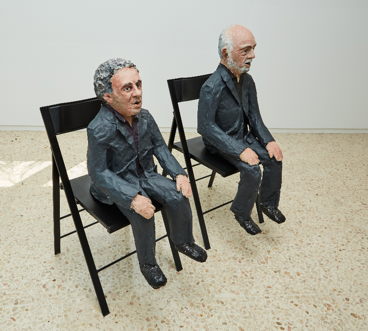Instalación sonora compuesta por dos muñecos realizado en papel maché, sillas, altavoces bluetooth y pista de audio estéreo (loop 9”)