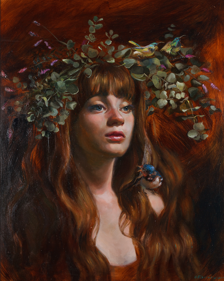 Retrato de mujer con corona en la cabeza y pájaros sobre plancha de cobre. El recurso de elementos simbólicos en sus dibujos y pinturas nos habla del súper yo y el deseo de la humanidad...