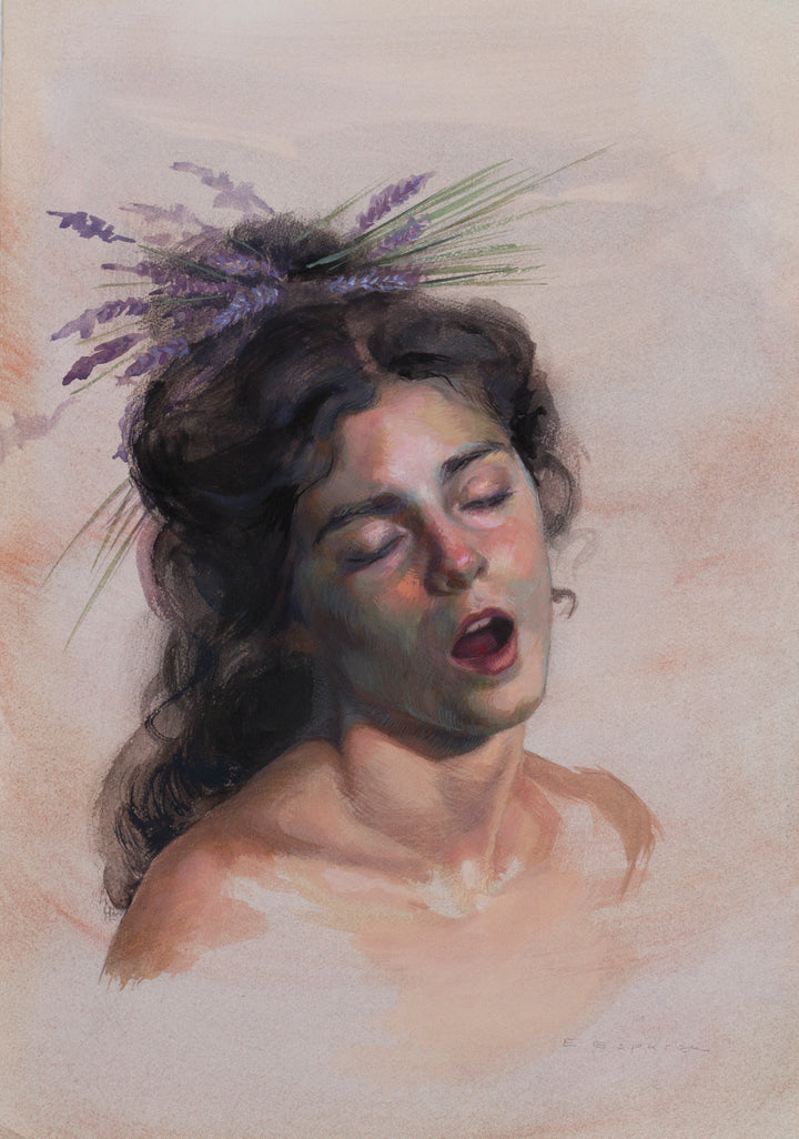 Retrato femenino en color, firmado a mano y con sello gofrado en lado inferior derecho. Obra única sobre papel montado en vitrina con cristal antirreflejo. El recurso de elementos simbólicos en sus dibujos y pinturas...
