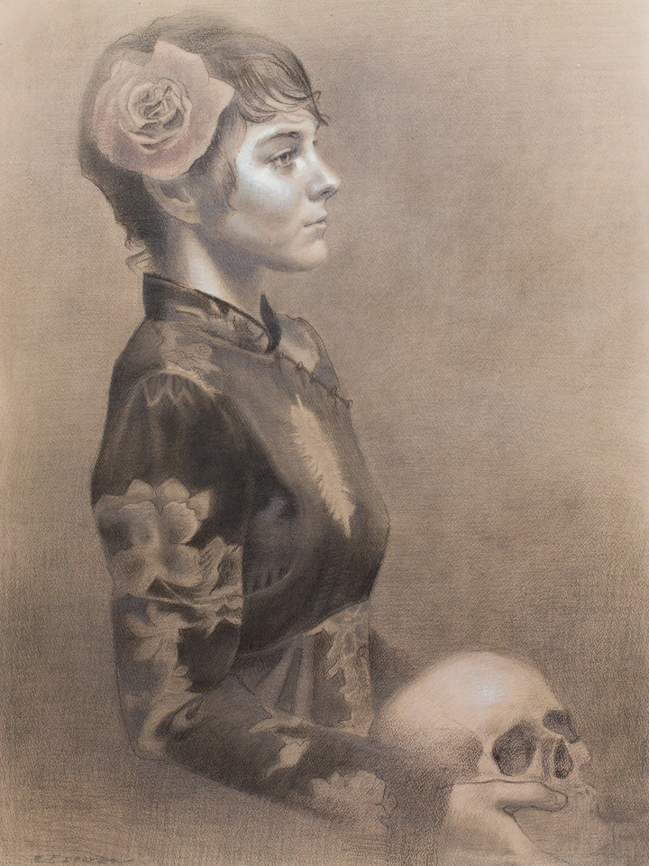 Retrato de niña medio cuerpo de perfil con calavera. El recurso de elementos simbólicos en sus dibujos y pinturas nos habla del súper yo y el deseo de la humanidad por su transformación etérea, asociado...